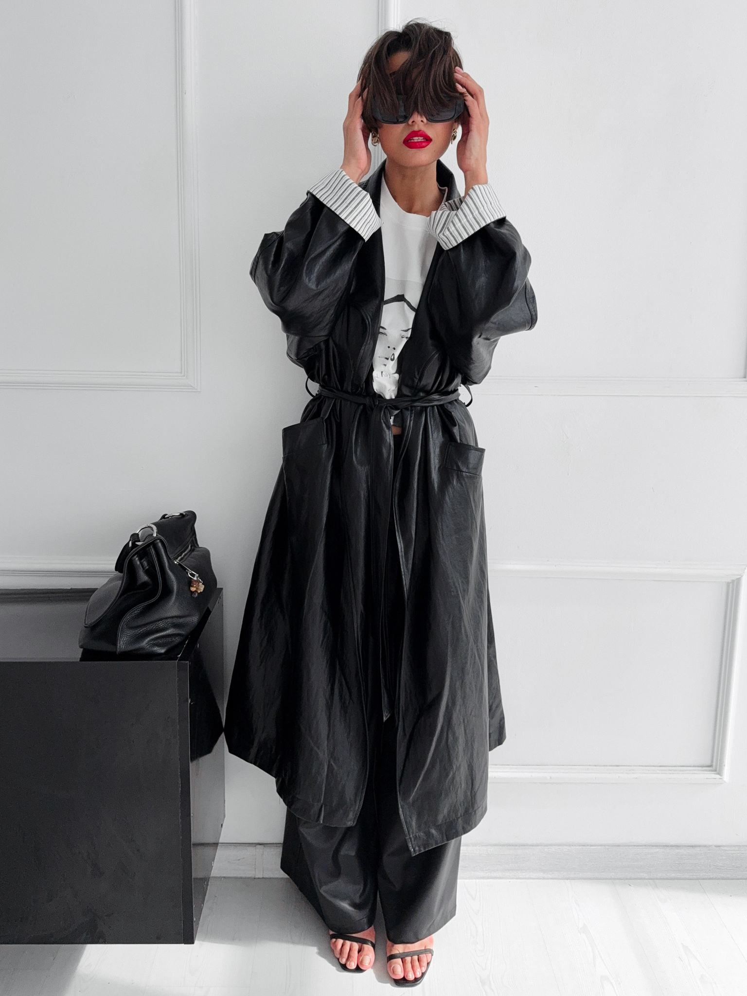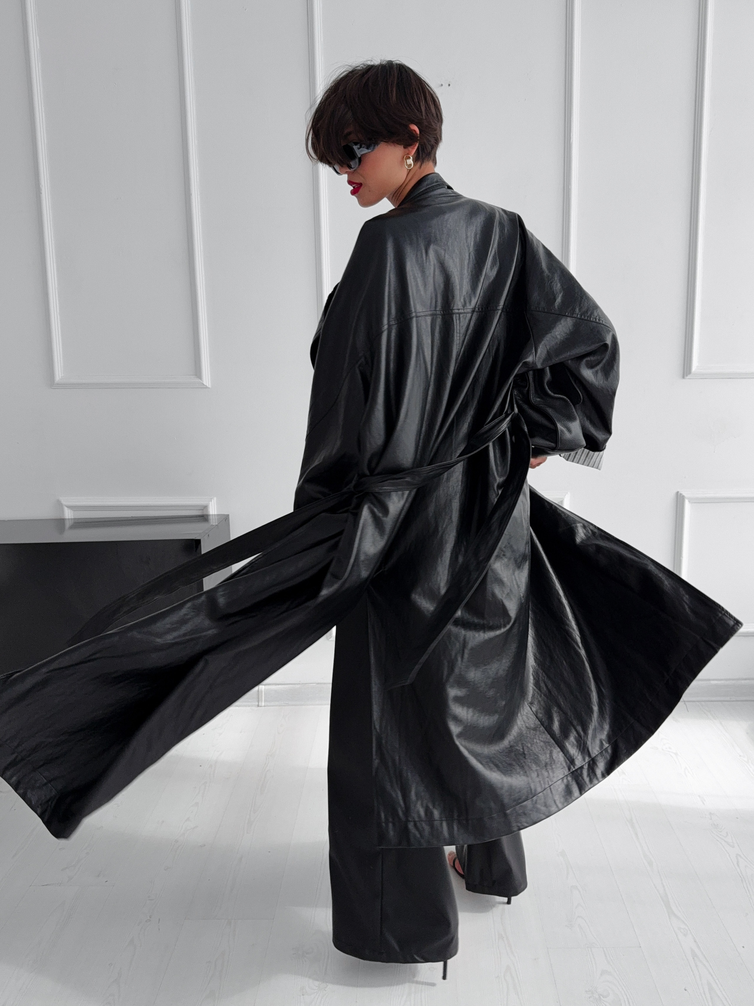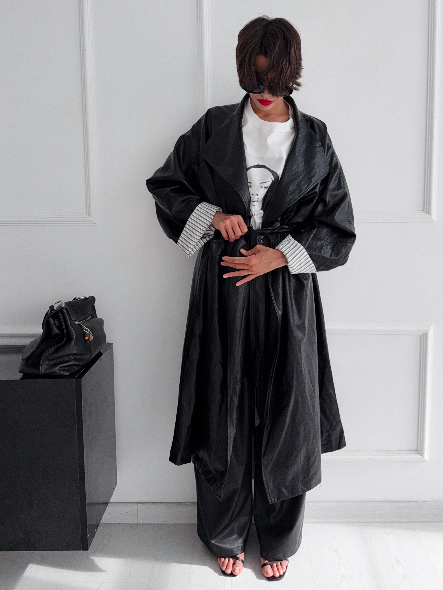 Однотонный черный плащ из экокожи с контрастными манжетами. Стильная модель с поясом для повседневных образов на весну и осень.