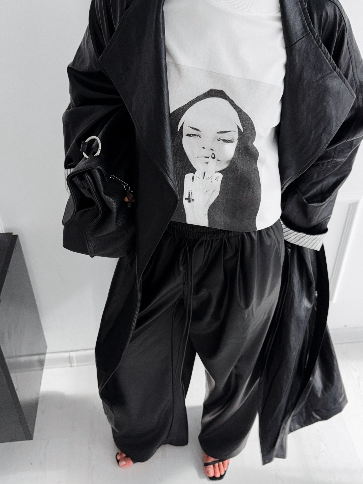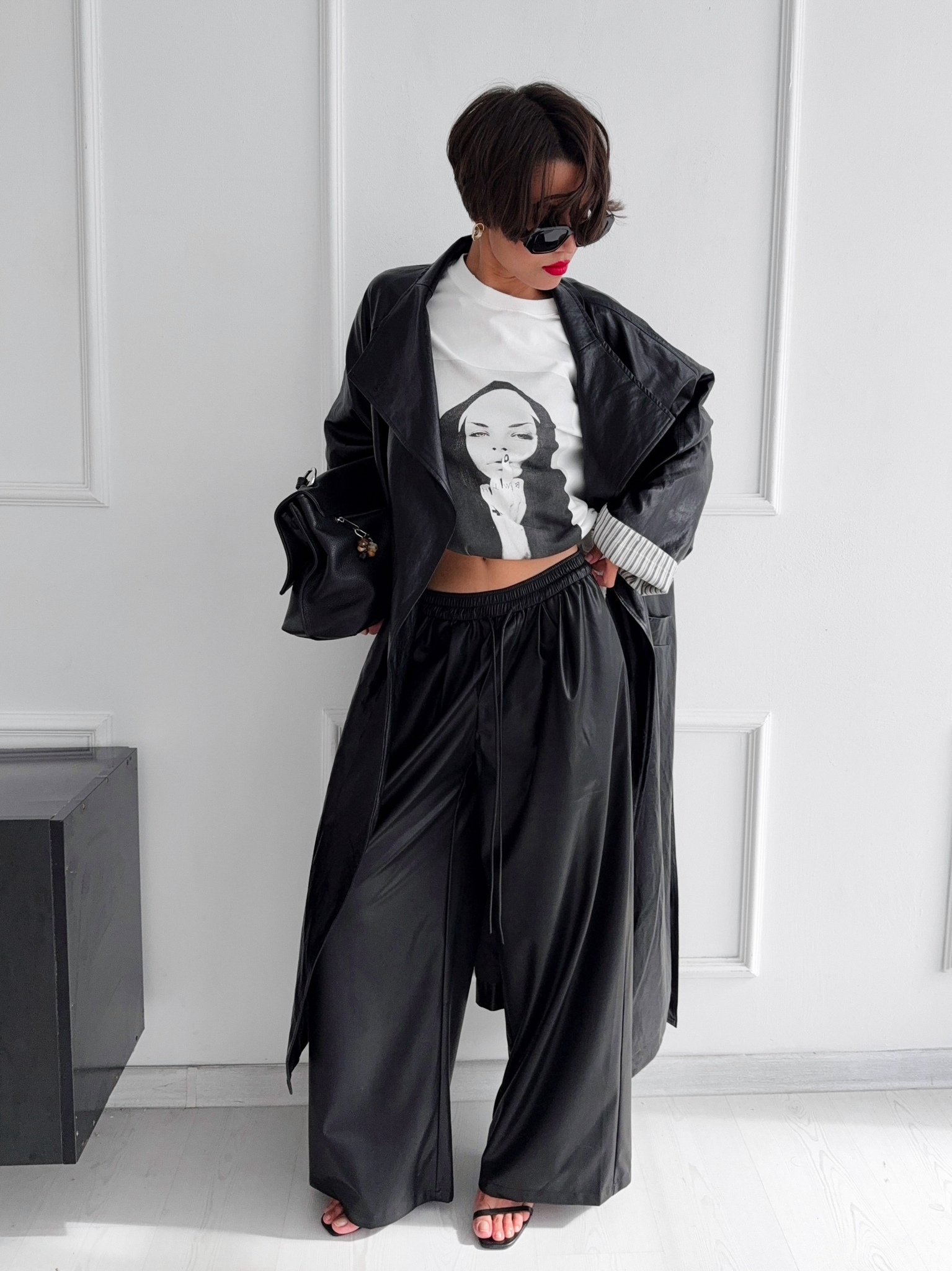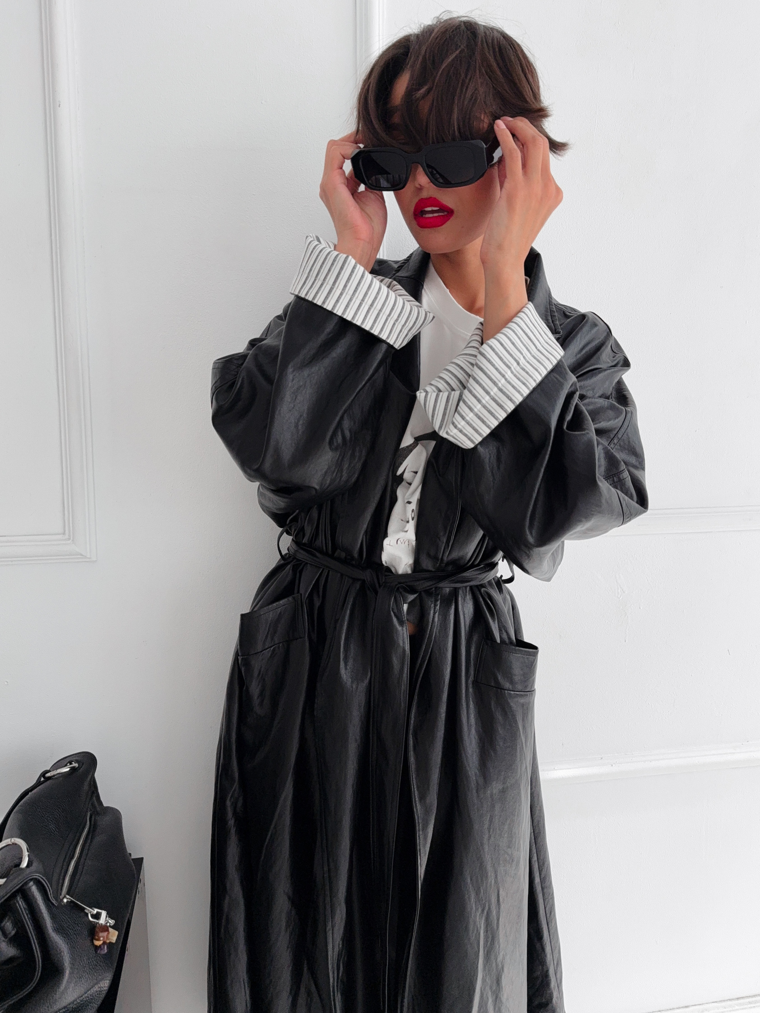 Однотонный черный плащ из экокожи с контрастными манжетами. Стильная модель с поясом для повседневных образов на весну и осень.