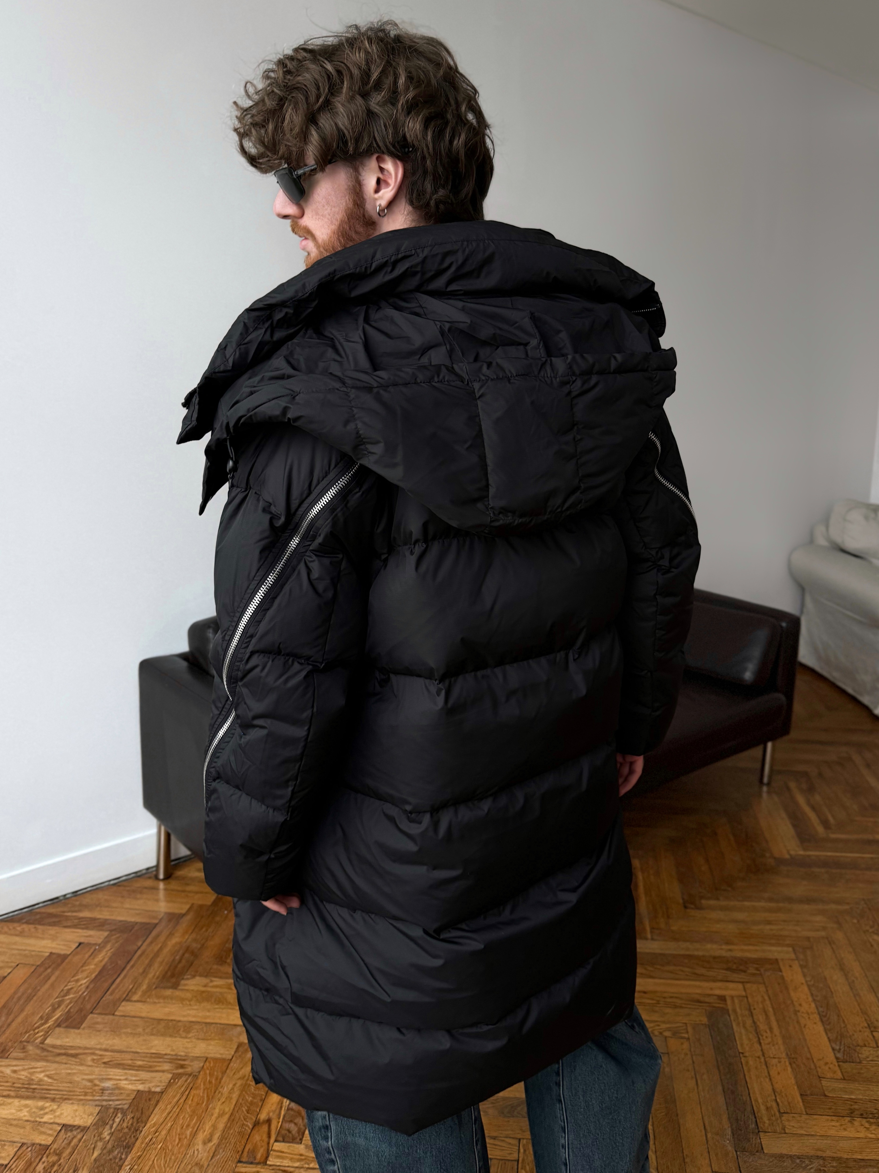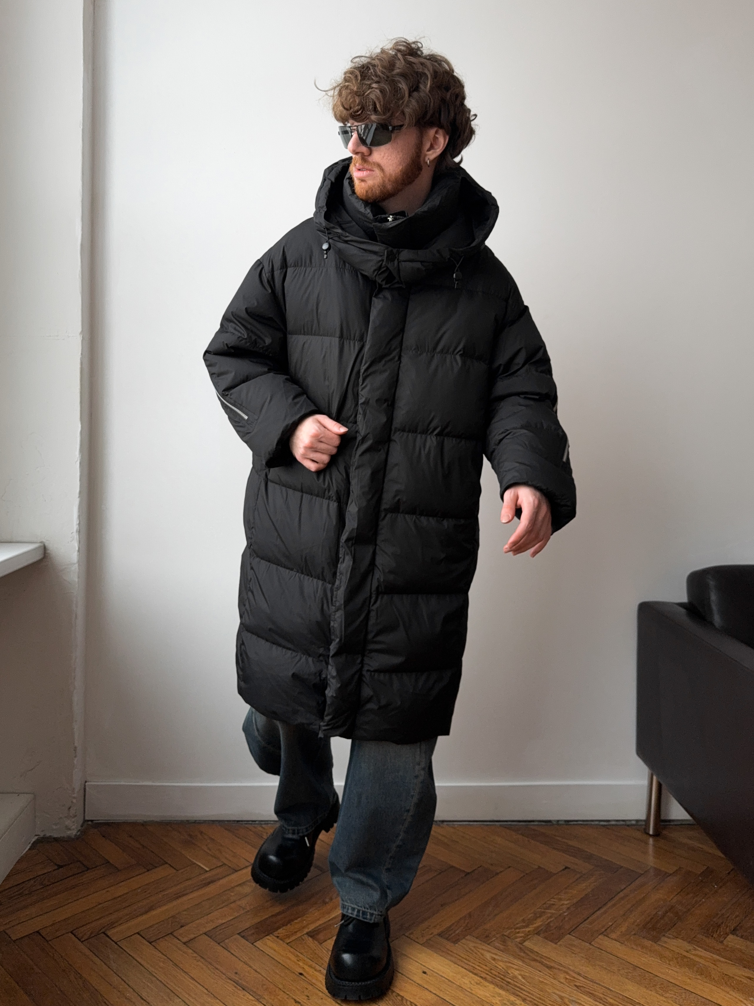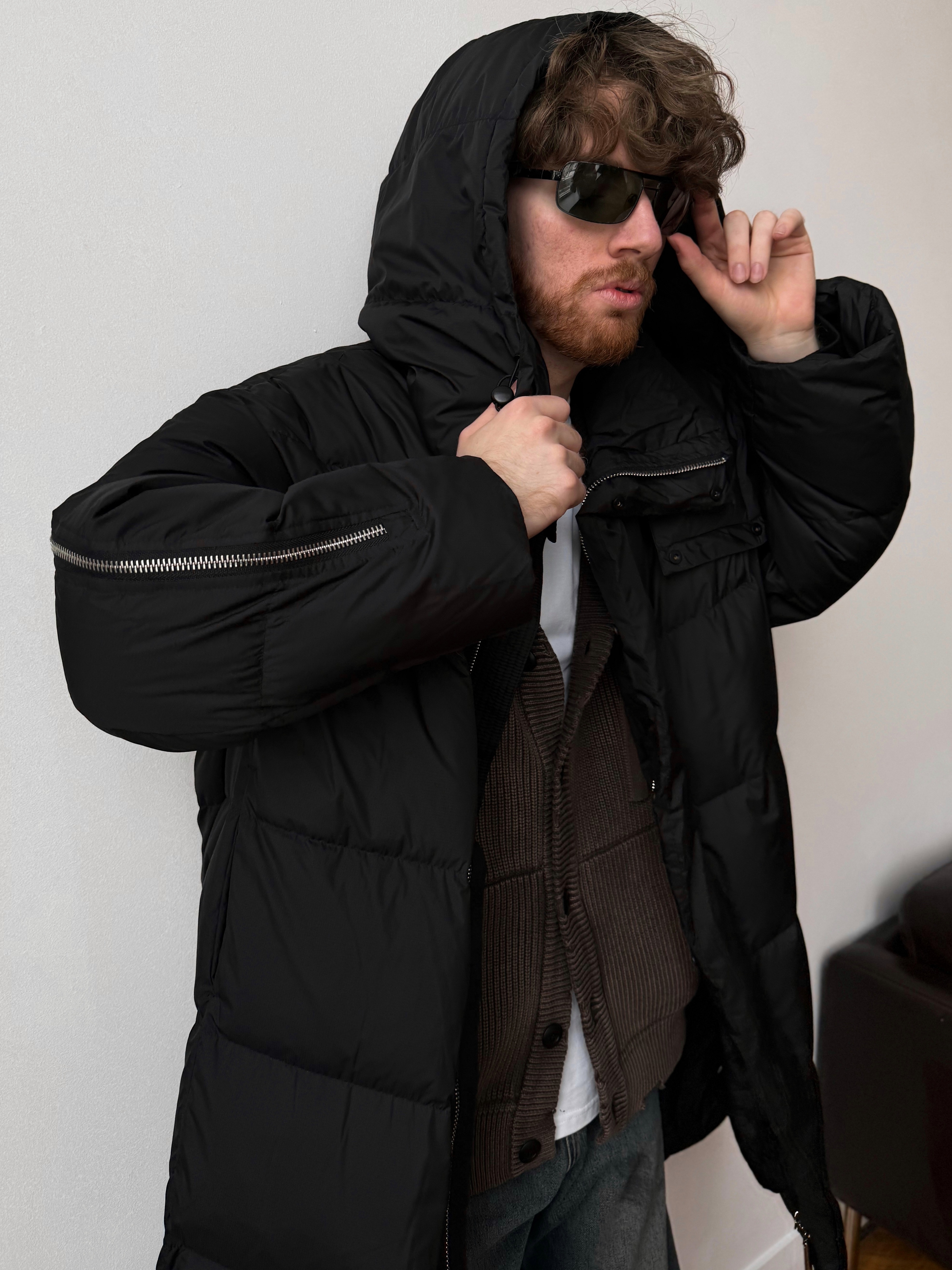 Удлиненная мужская куртка черного цвета. Модель с современным дизайном для создания стильного зимнего образа.