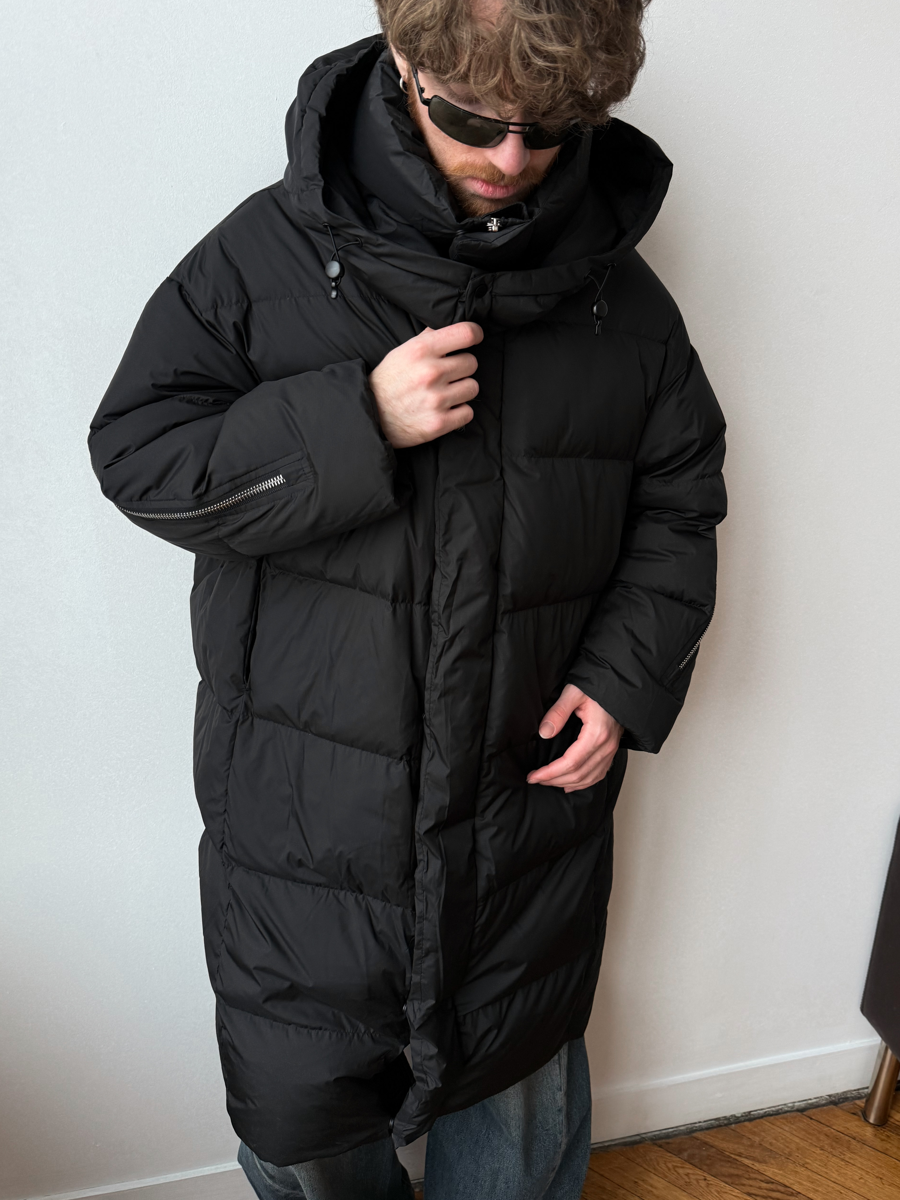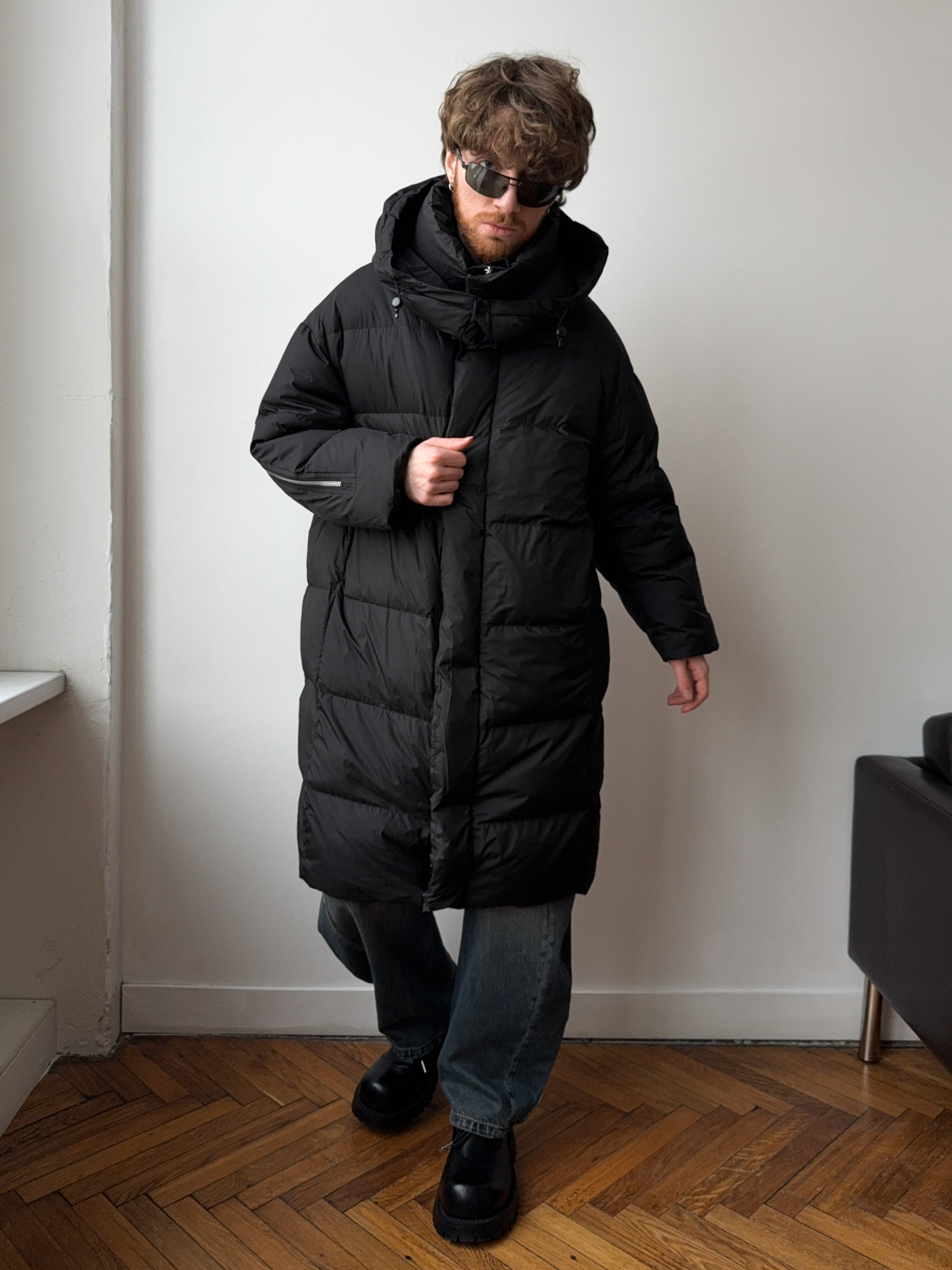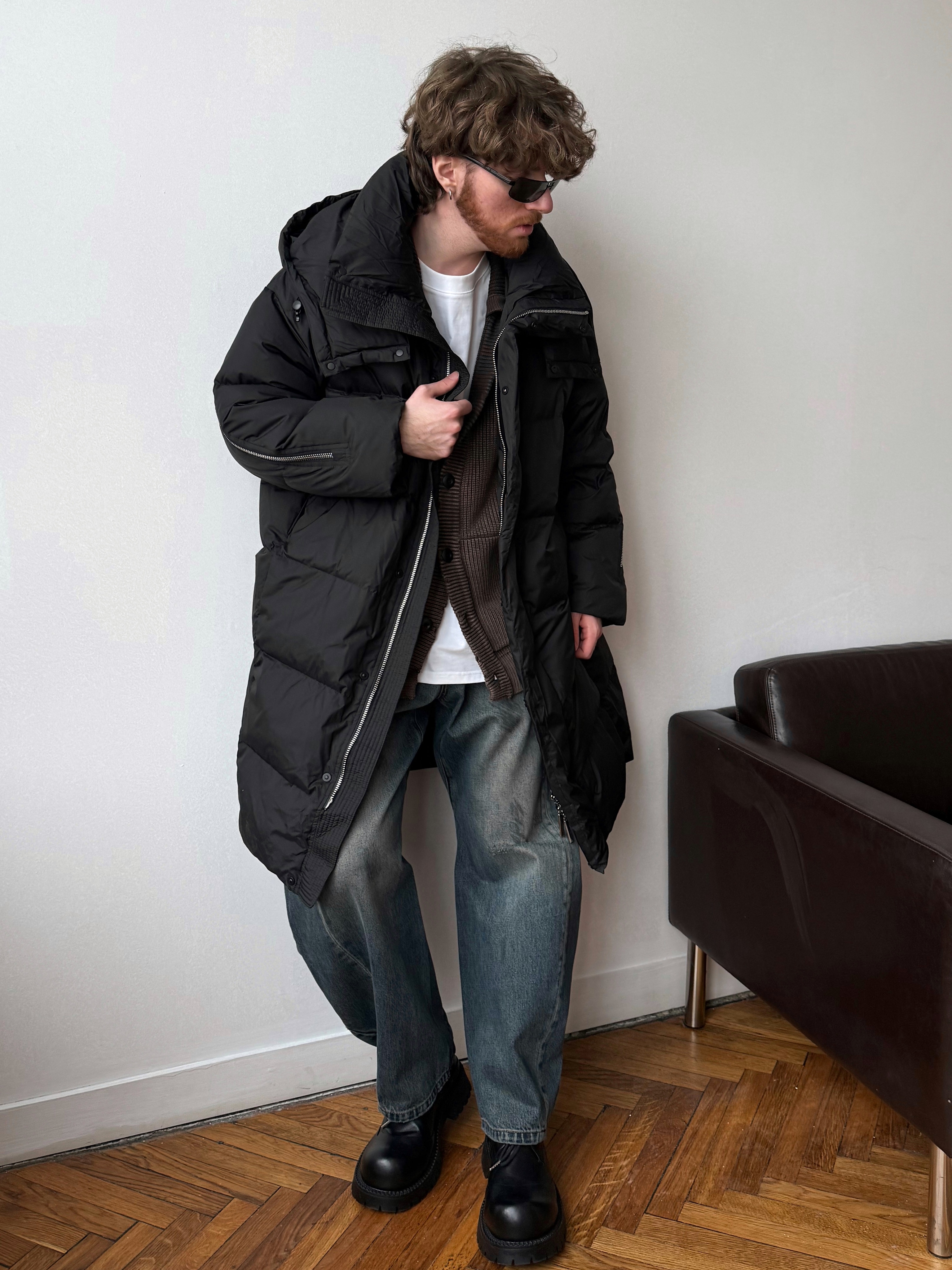 Удлиненная мужская куртка черного цвета. Модель с современным дизайном для создания стильного зимнего образа.