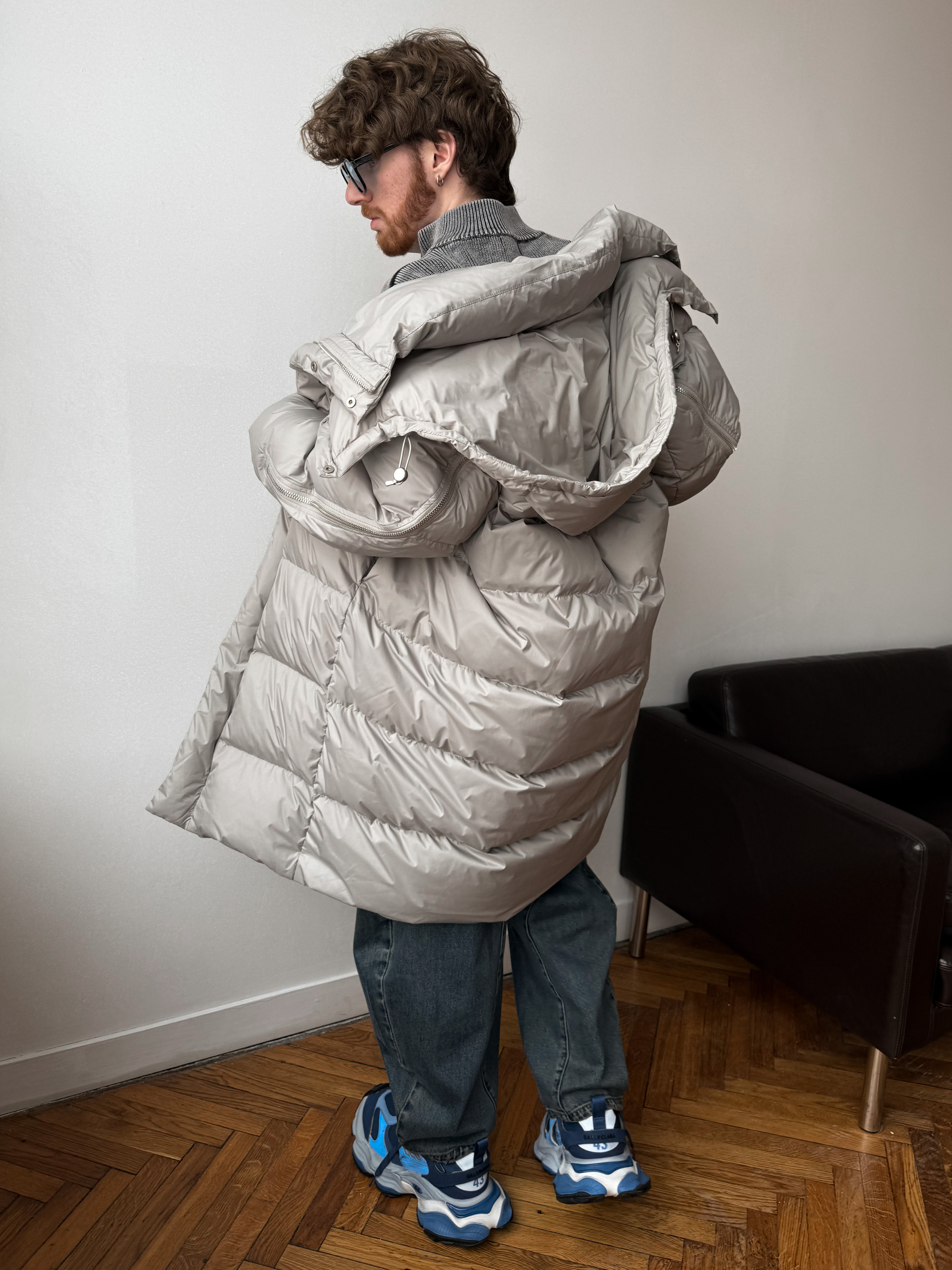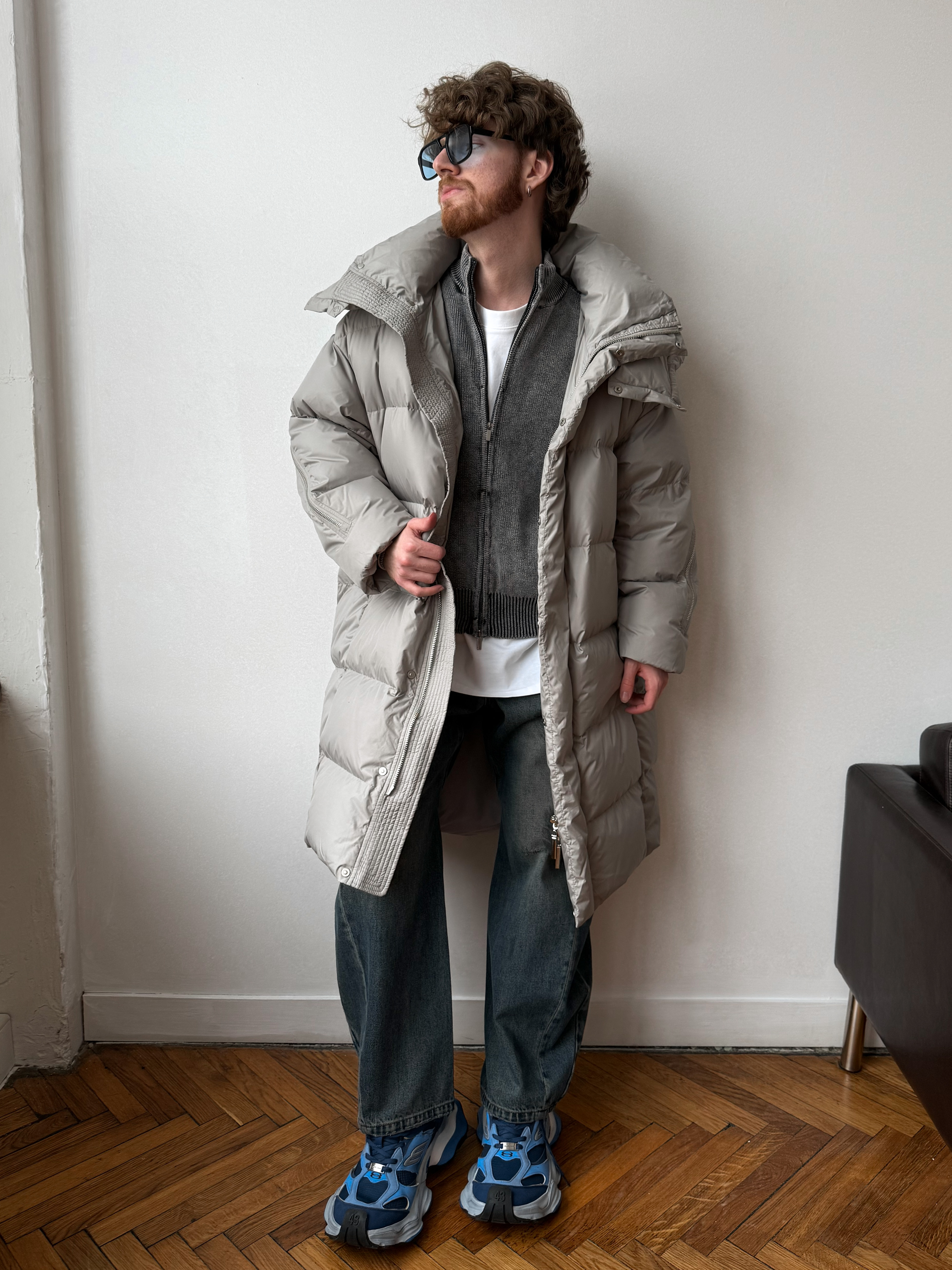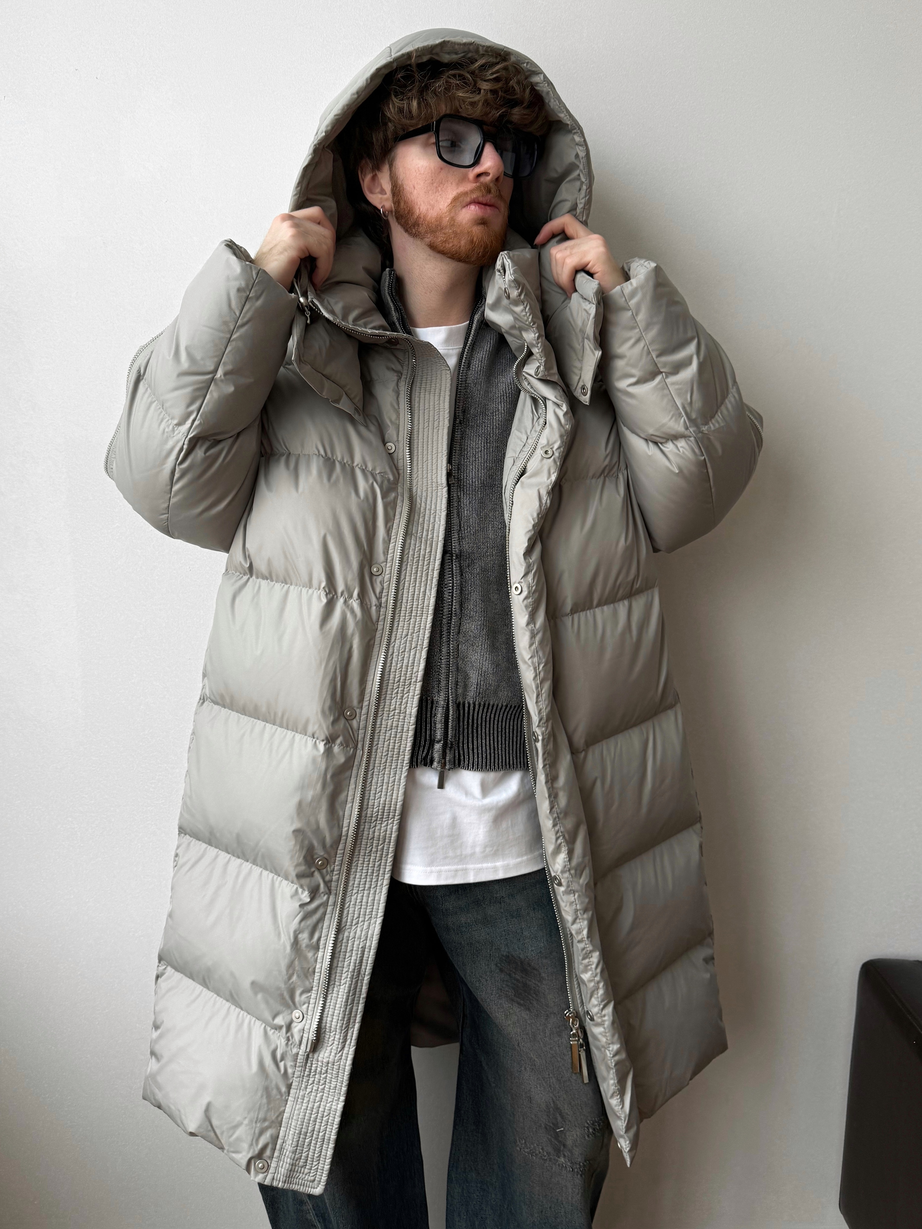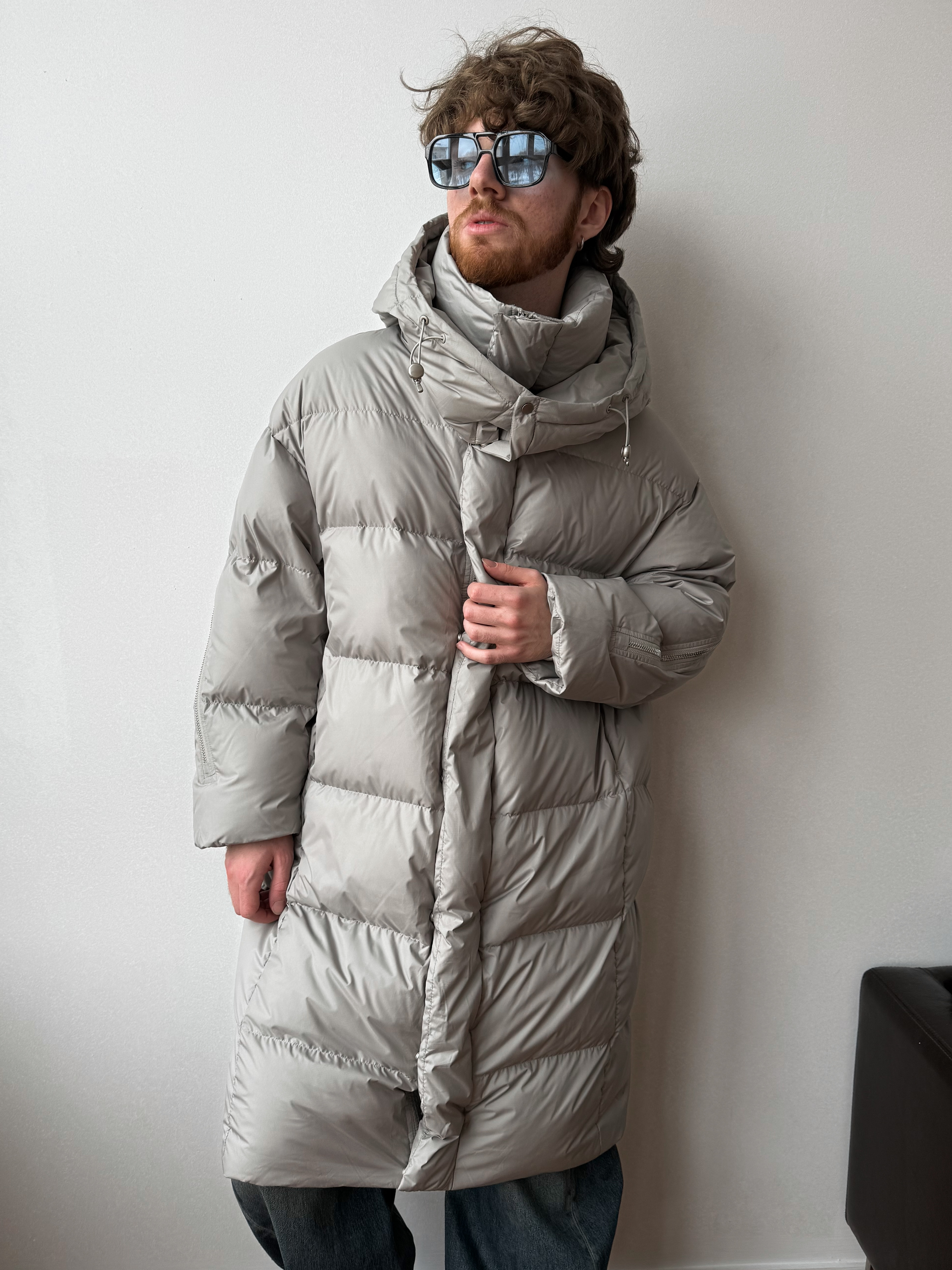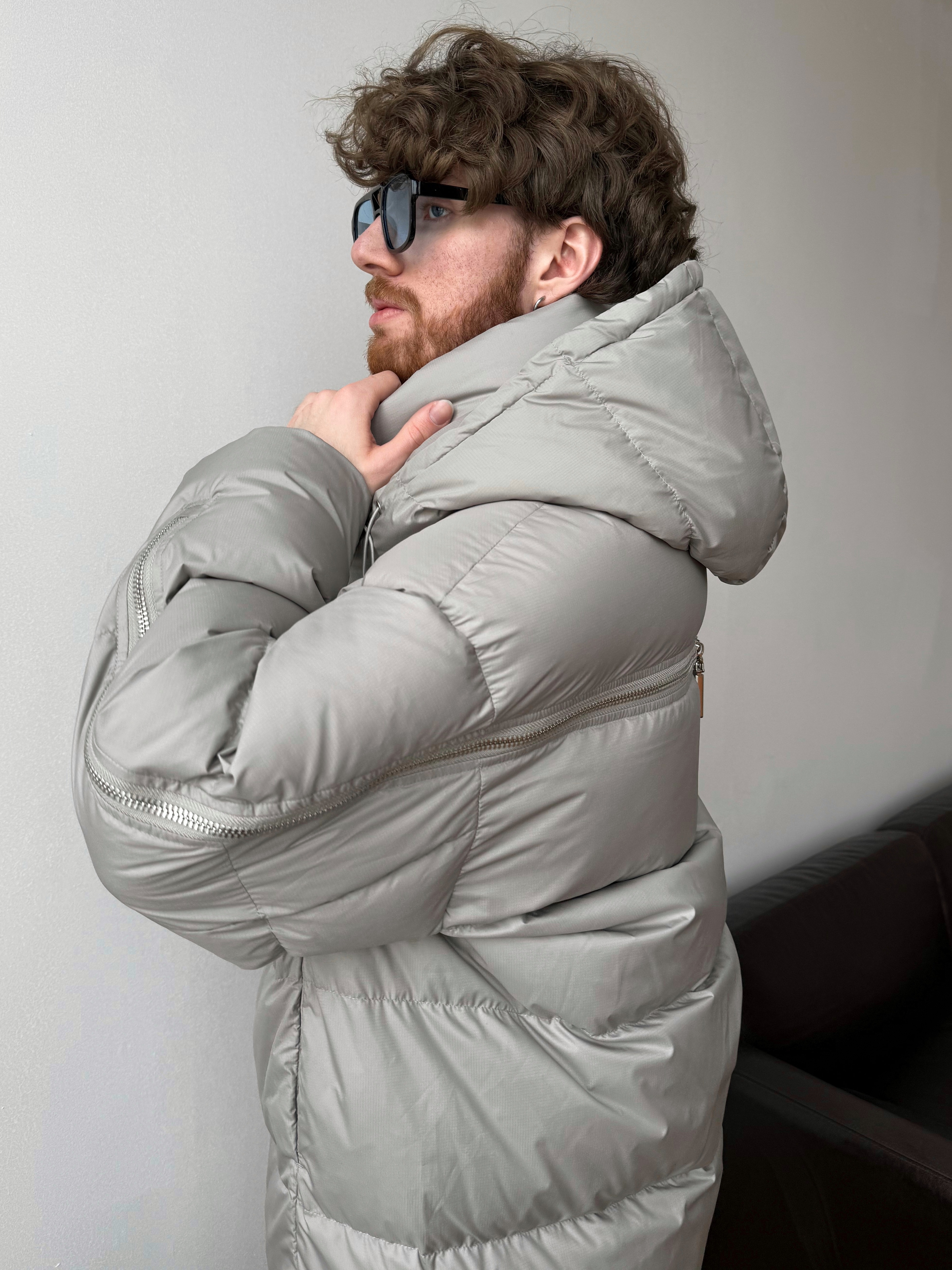 Удлиненная мужская куртка серого цвета. Модель с современным дизайном для создания стильного зимнего образа.