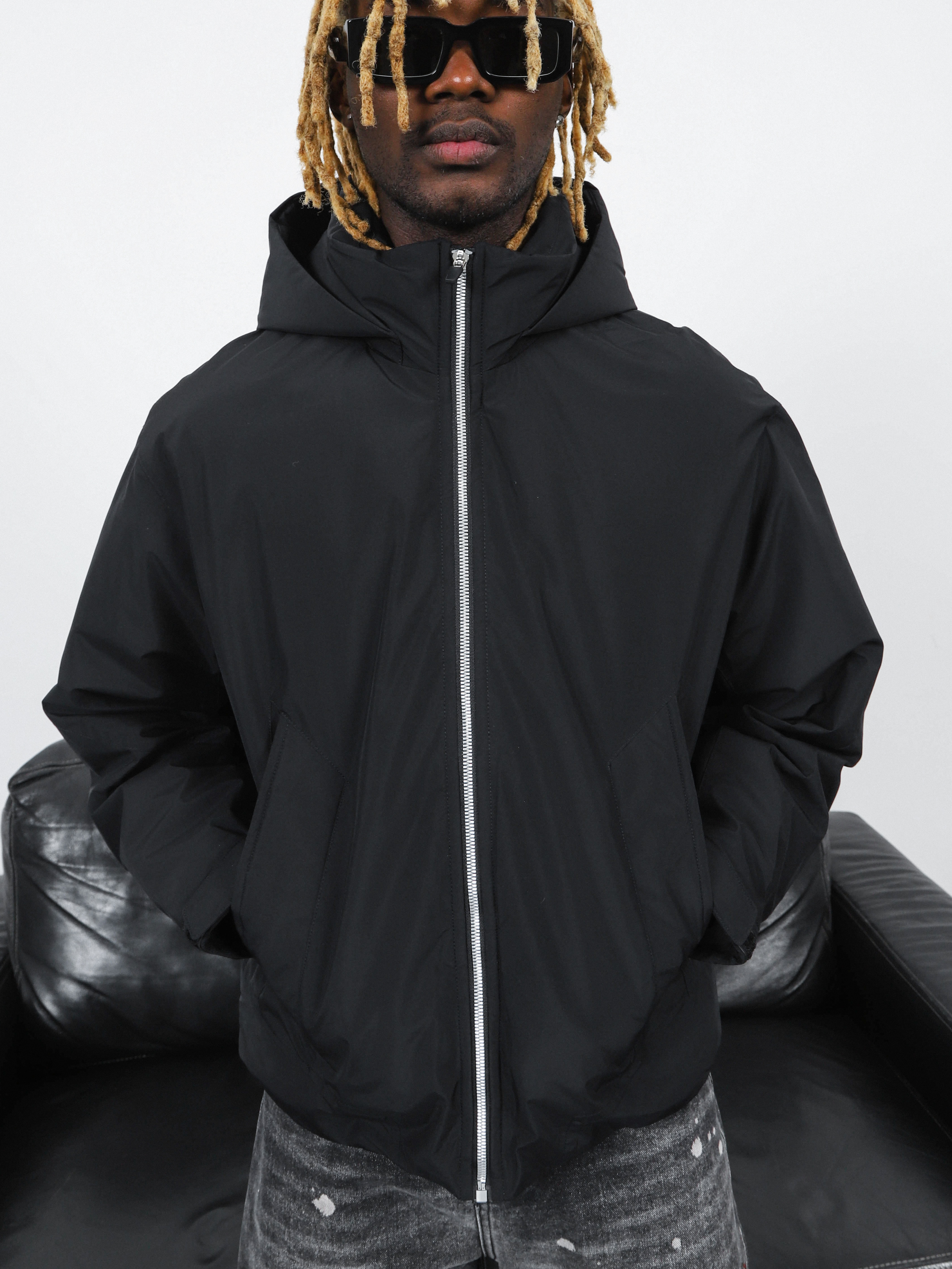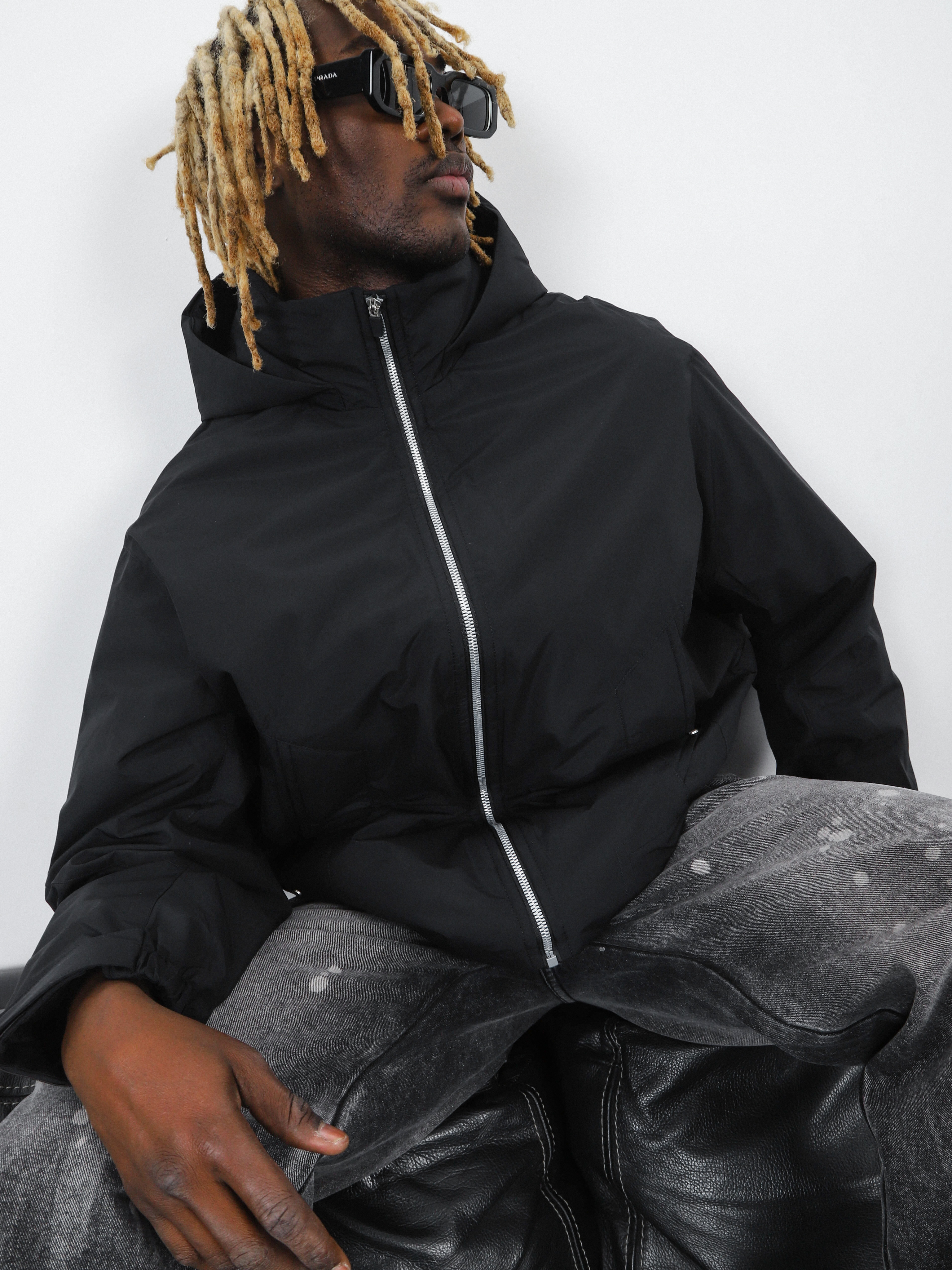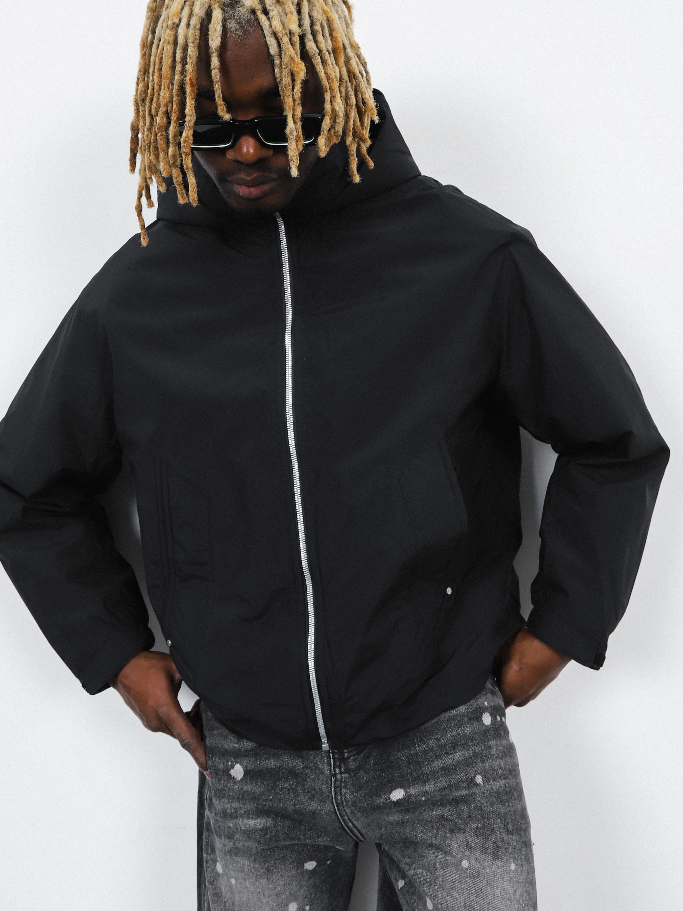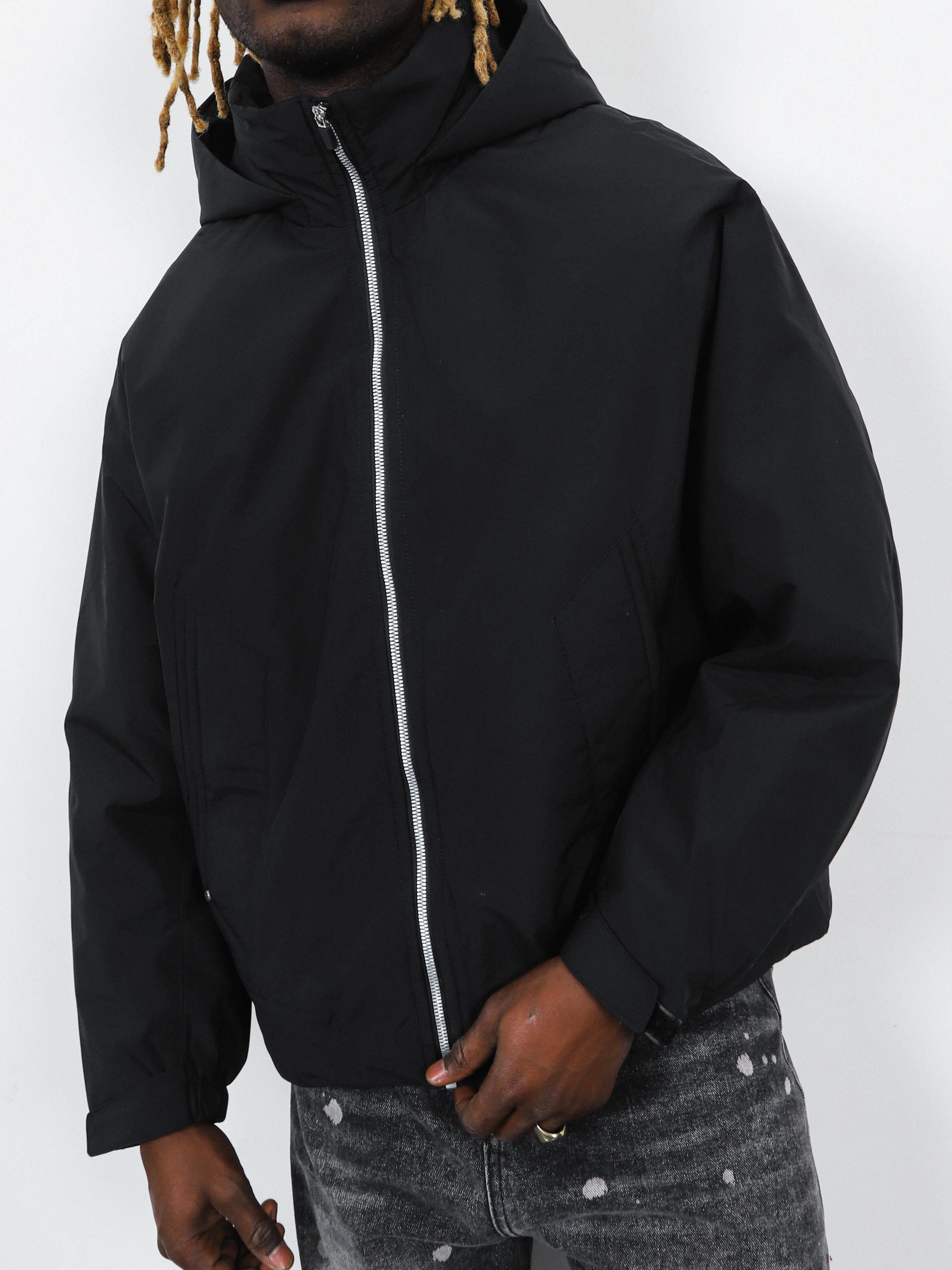 Укороченная мужская куртка черного цвета с высоким воротником и капюшоном.