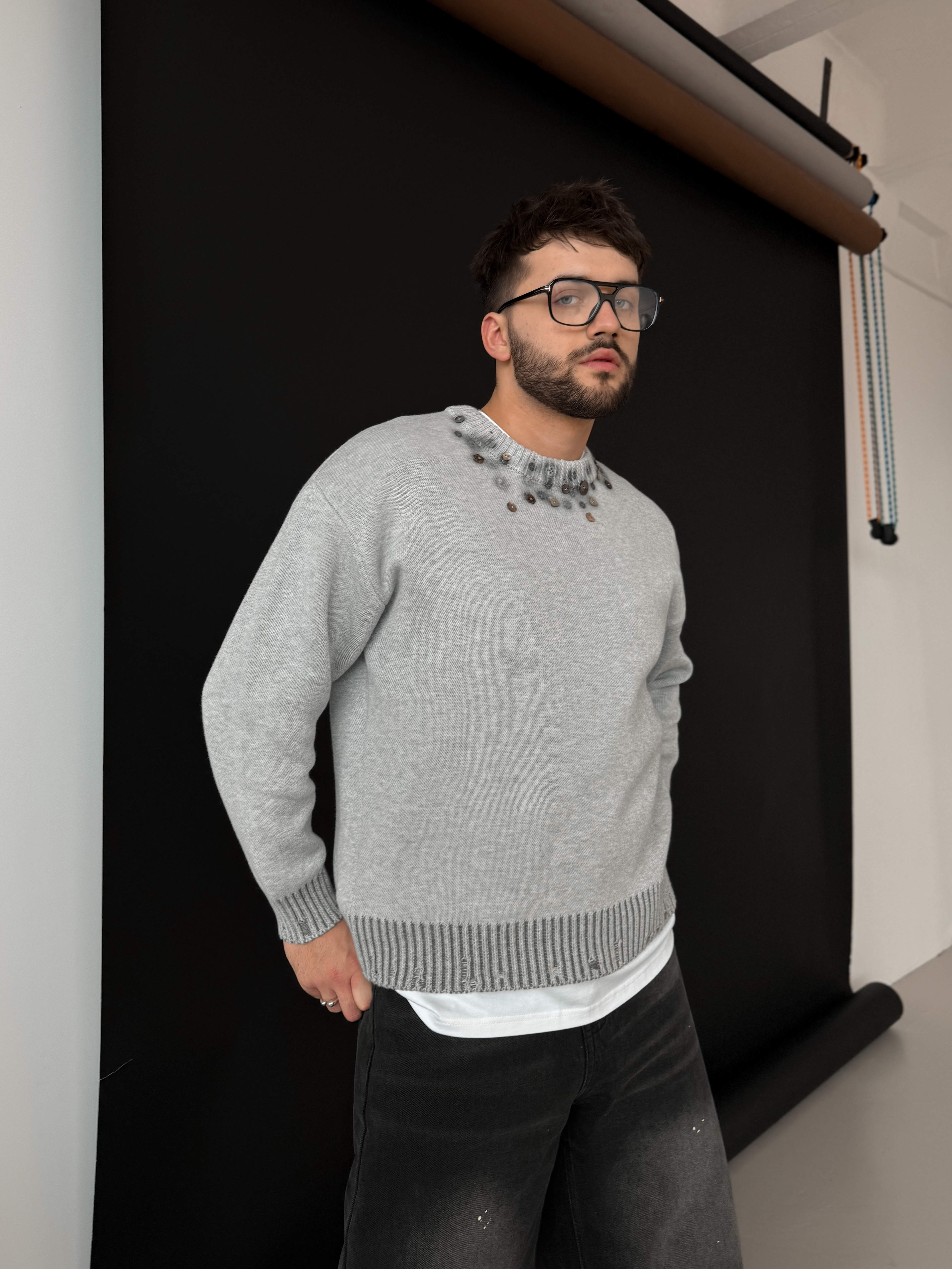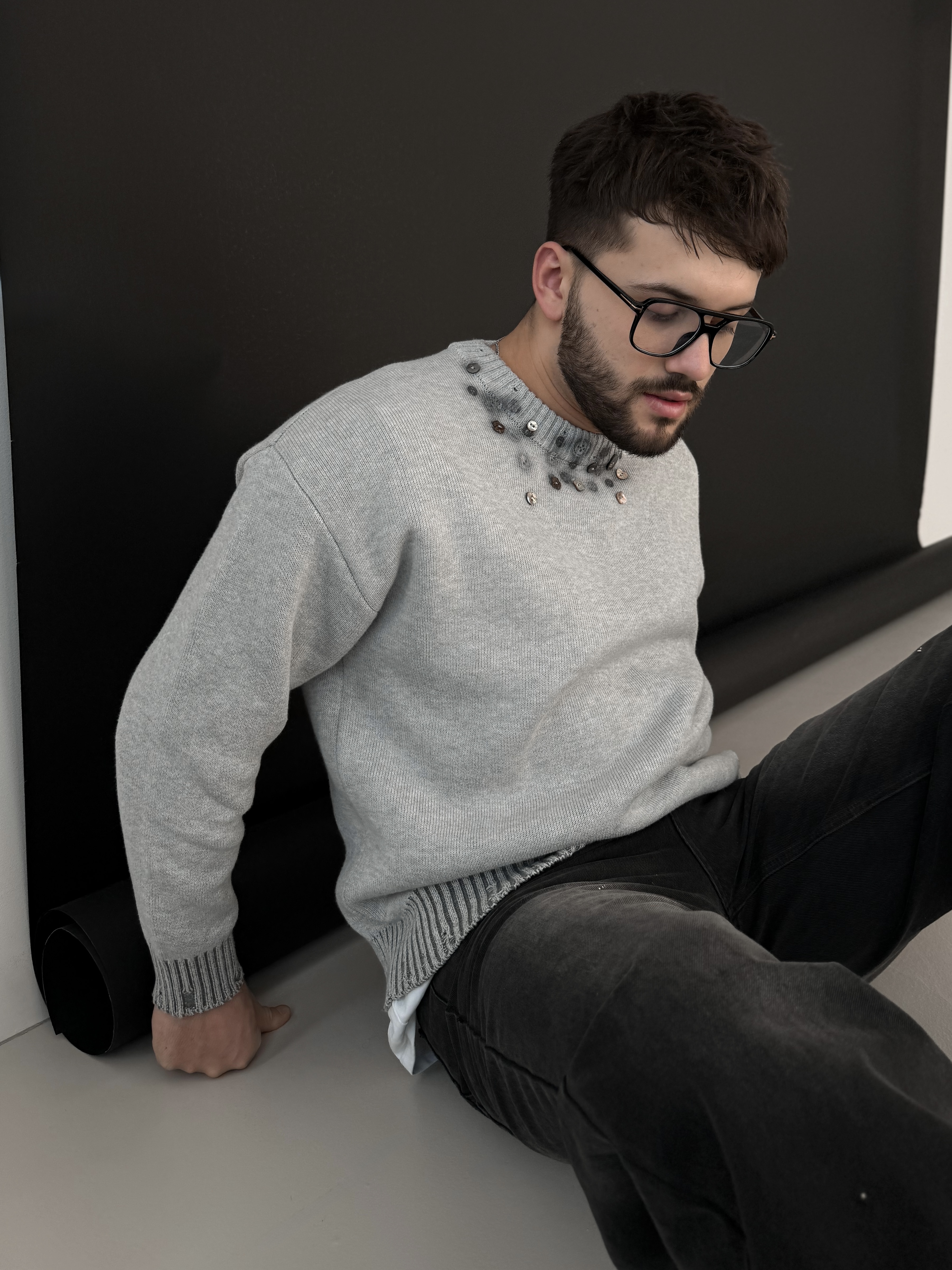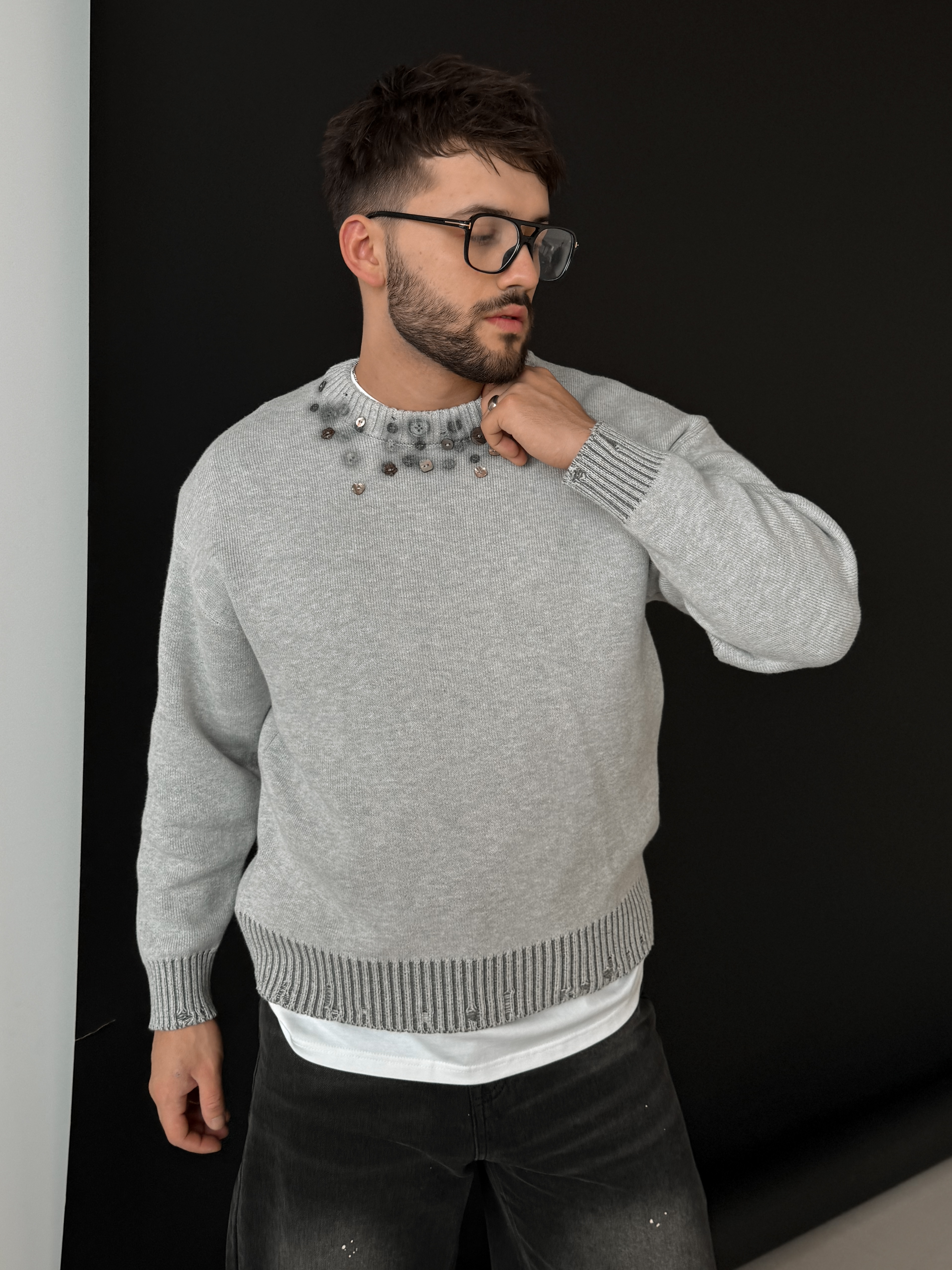 "Рваный" мужской свитер с декором из пуговиц. Стильная модель для повседневных образов поможет выделиться из толпы.