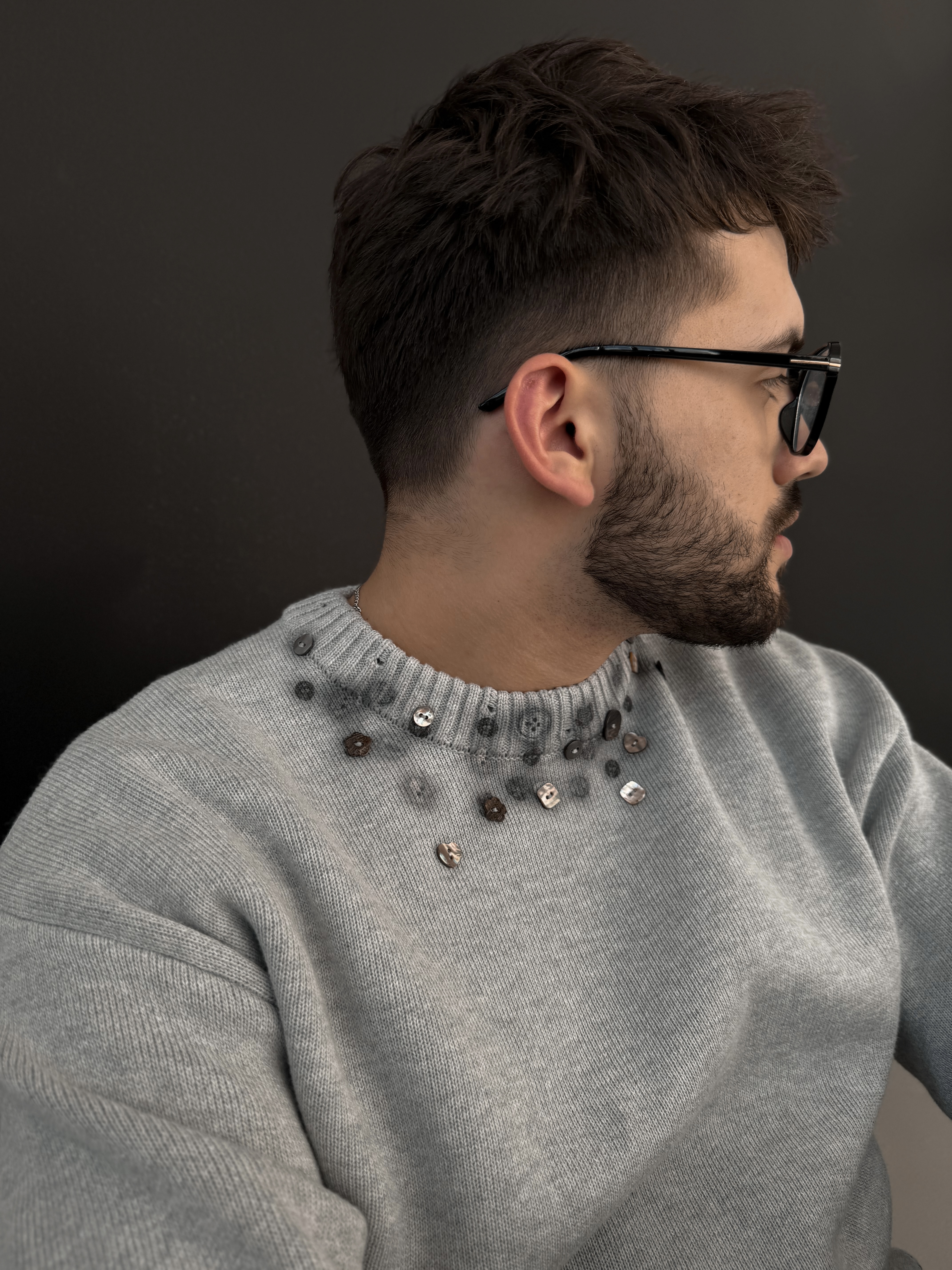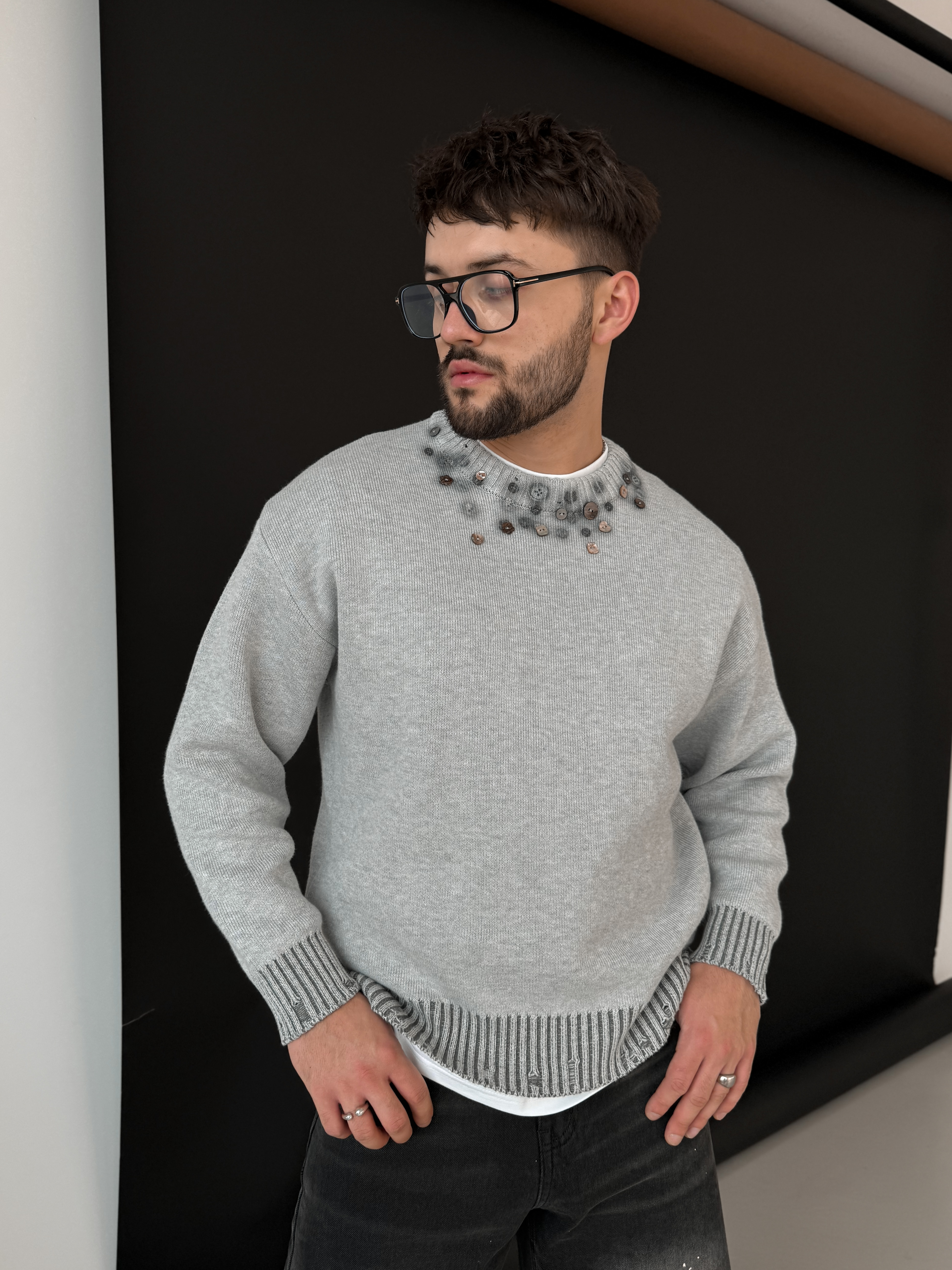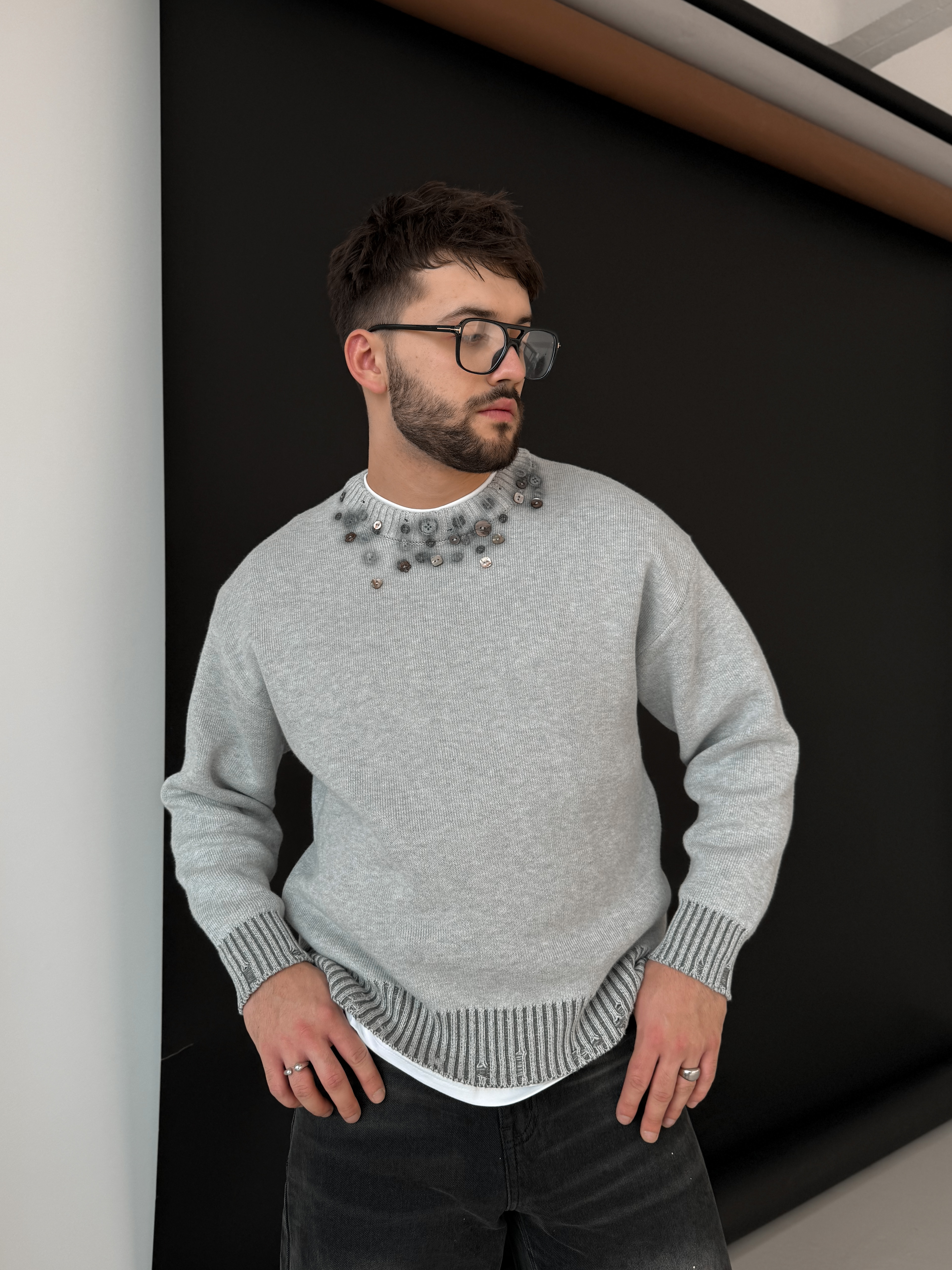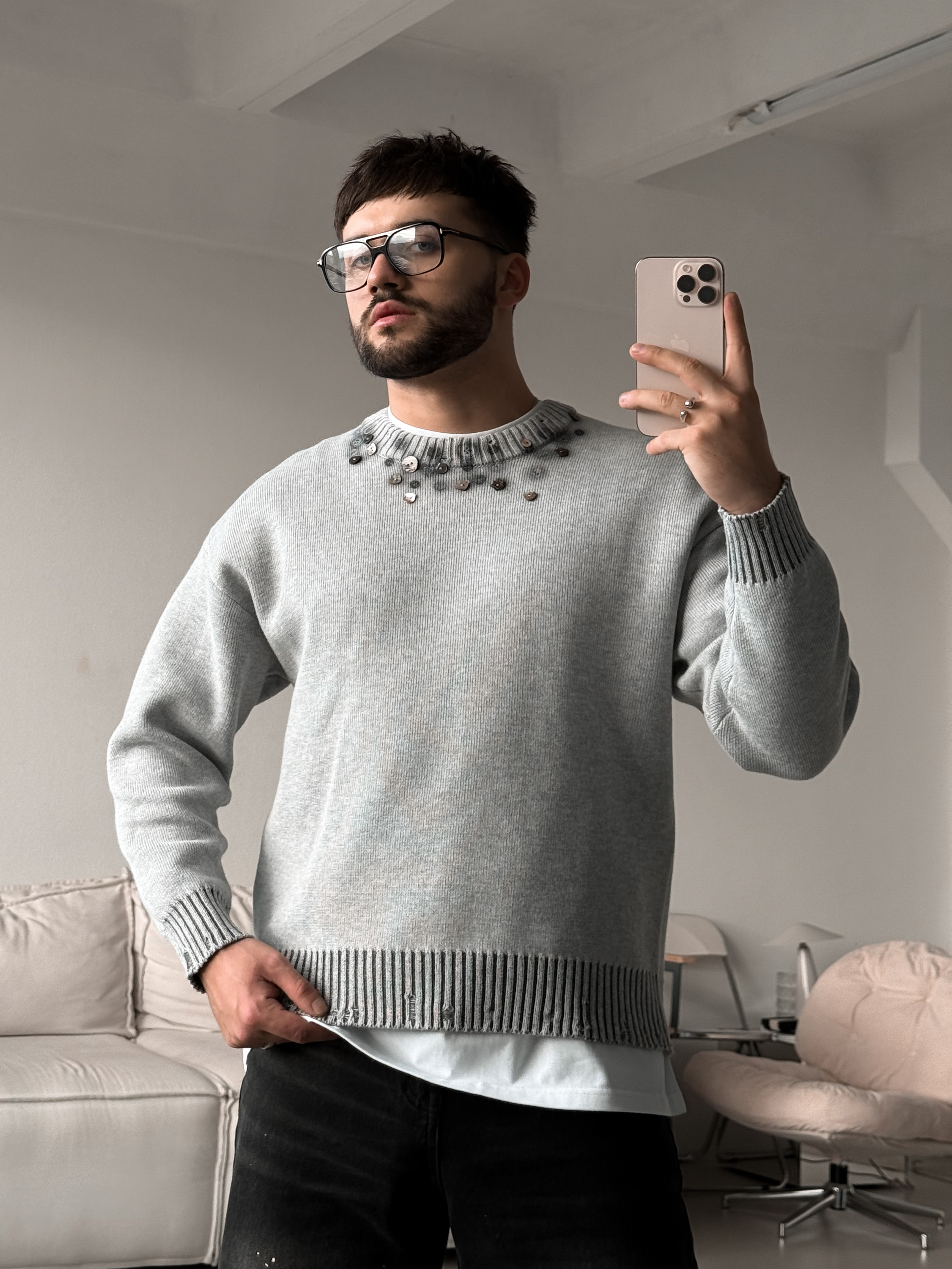 "Рваный" мужской свитер с декором из пуговиц. Стильная модель для повседневных образов поможет выделиться из толпы.