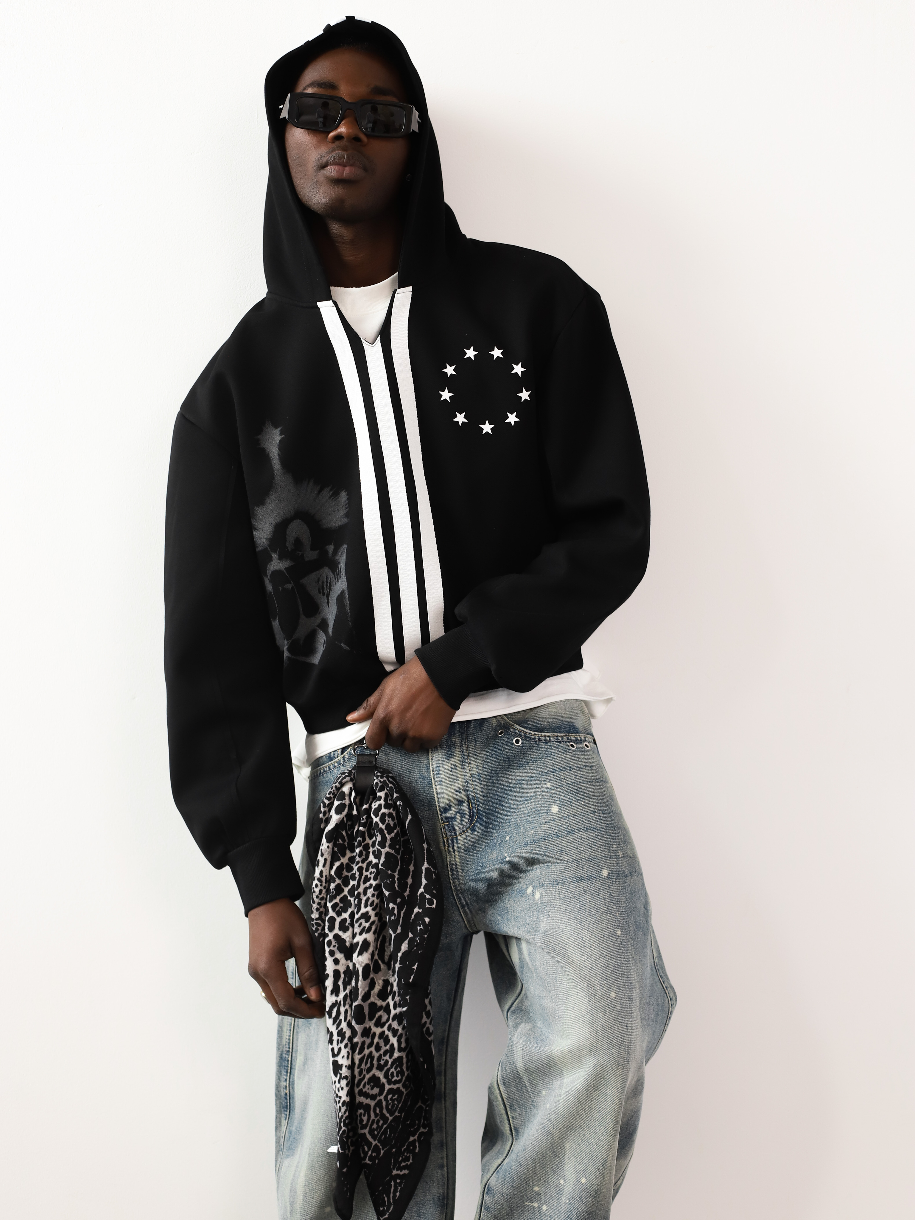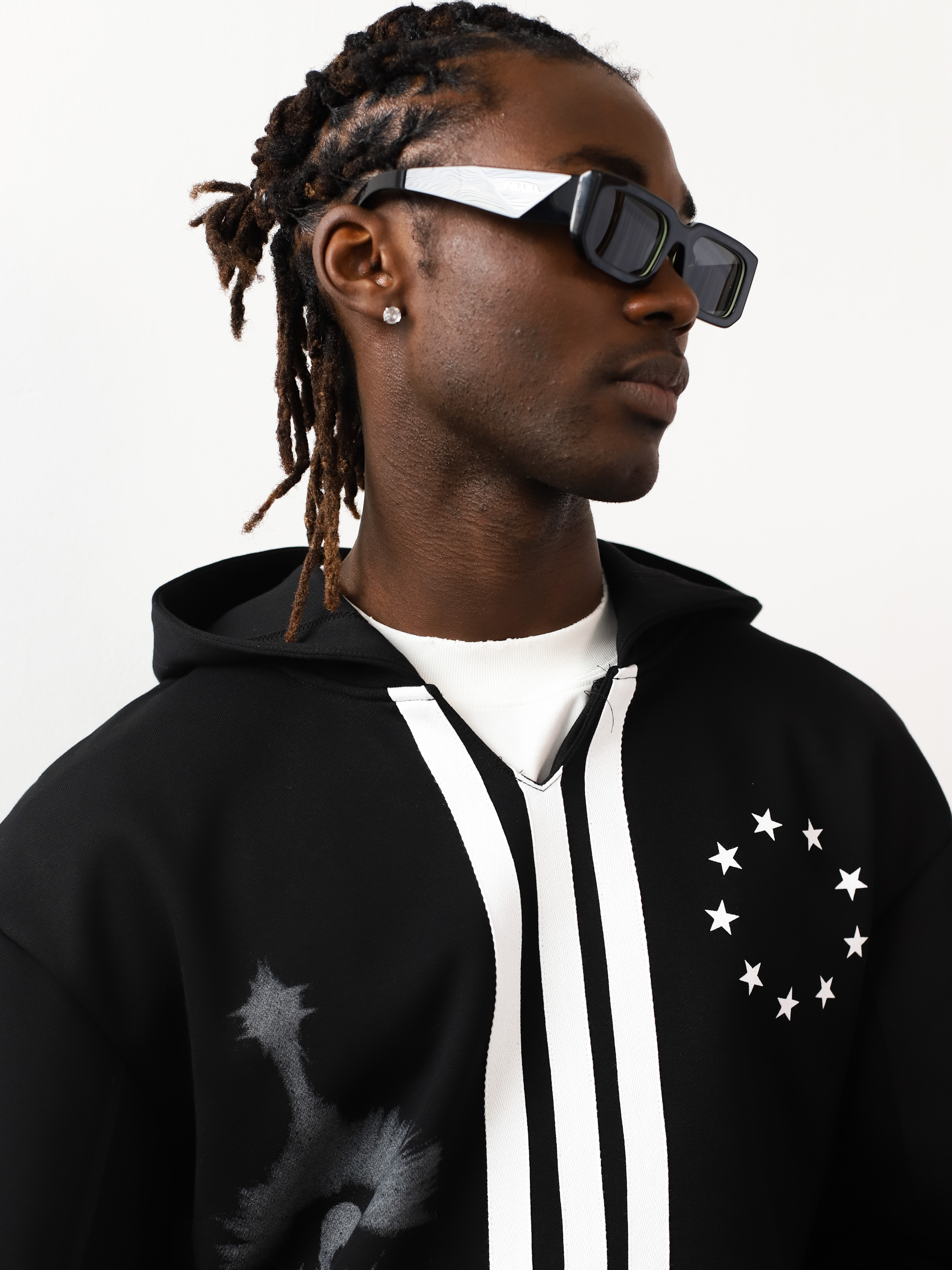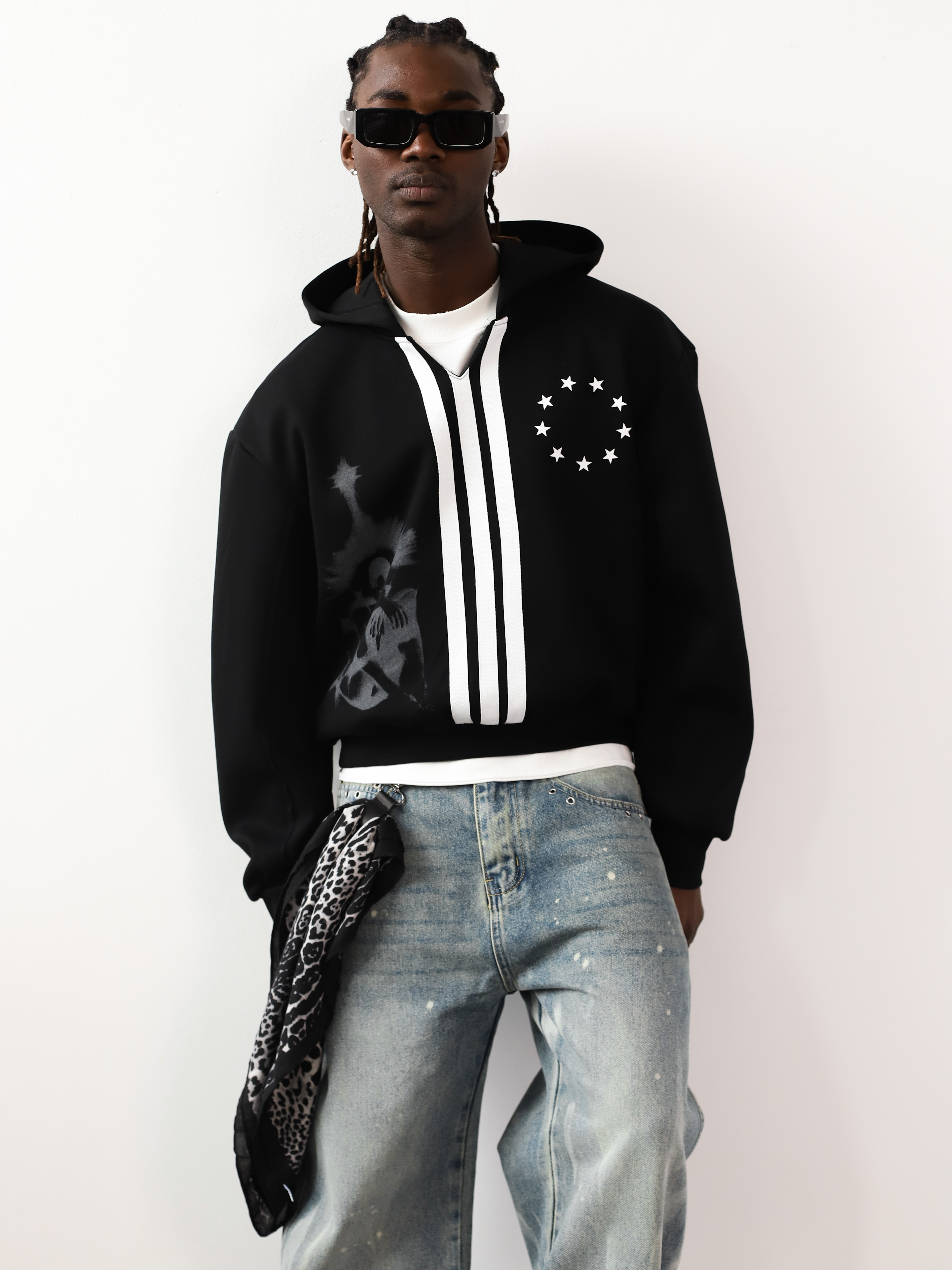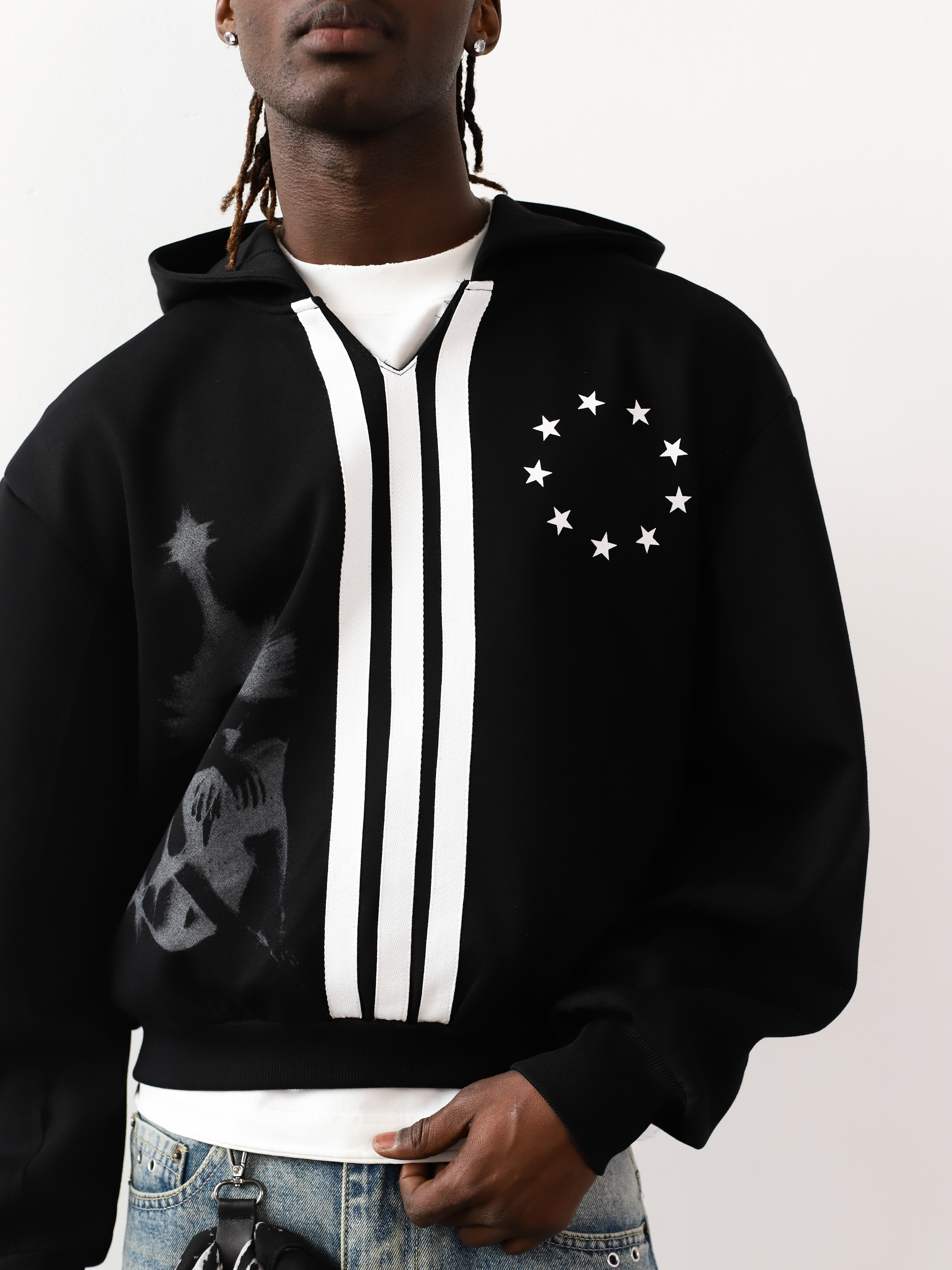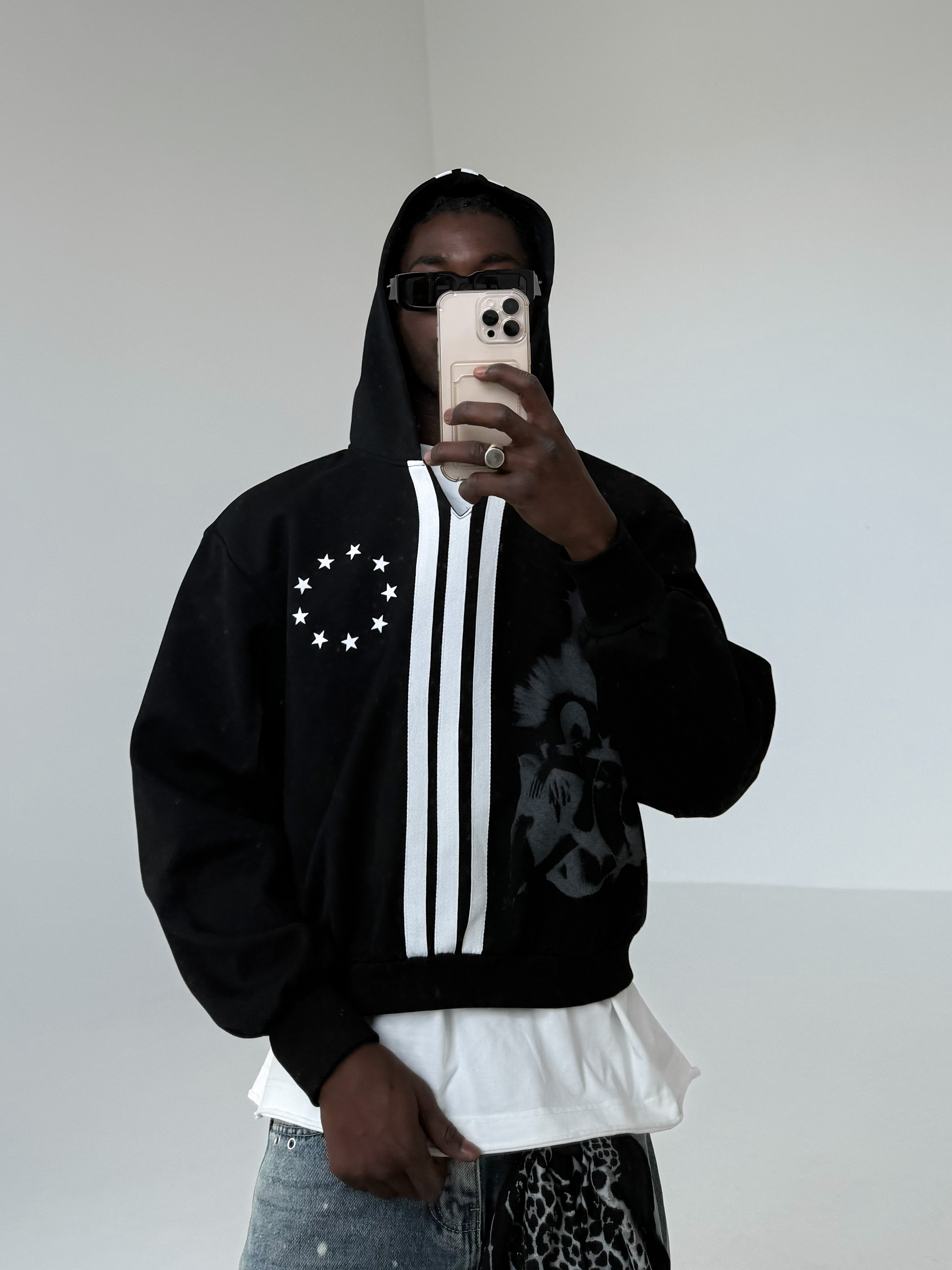 Черная мужская толстовка с принтами и белыми полосами для стильных образов на каждый день.