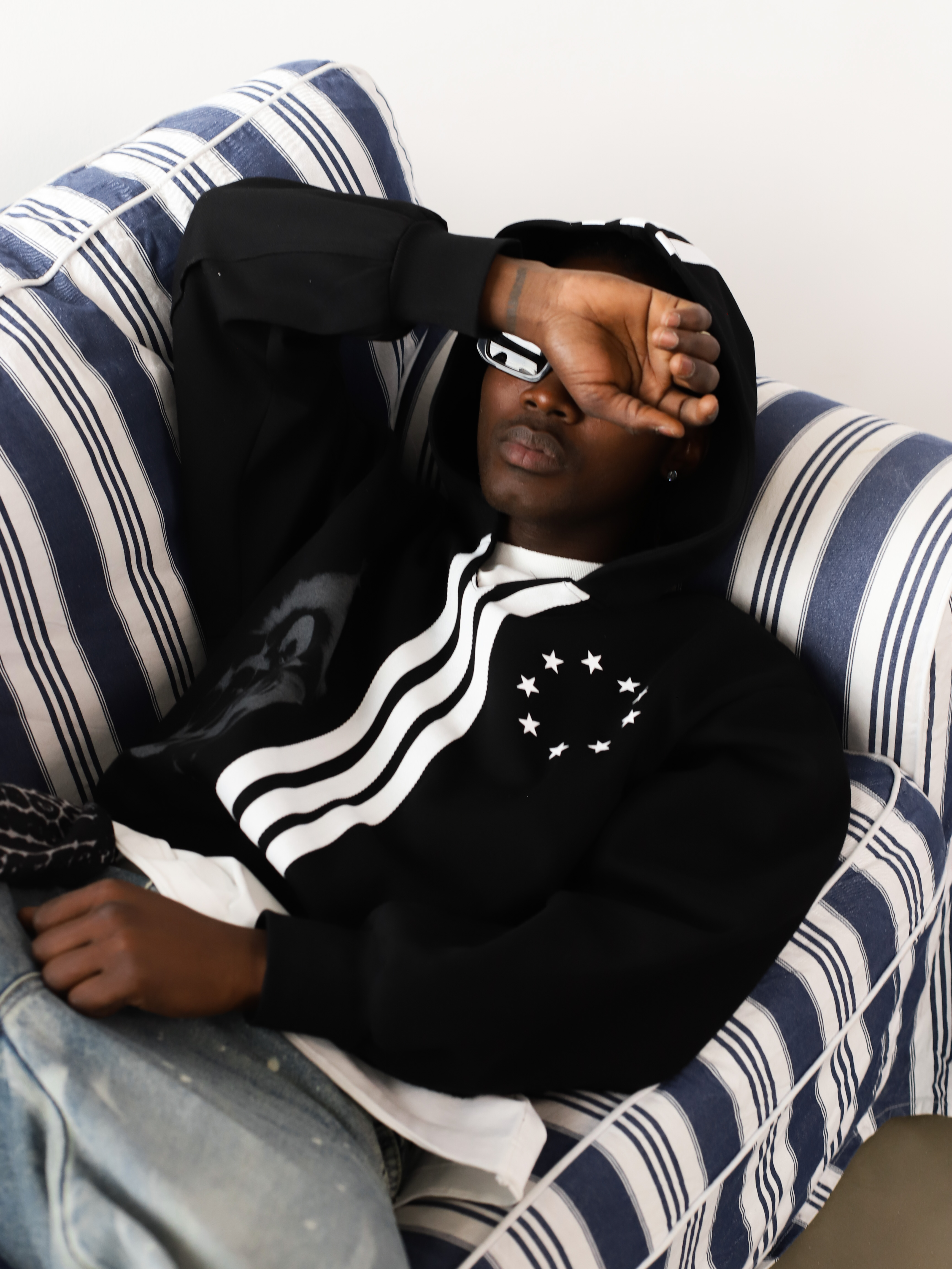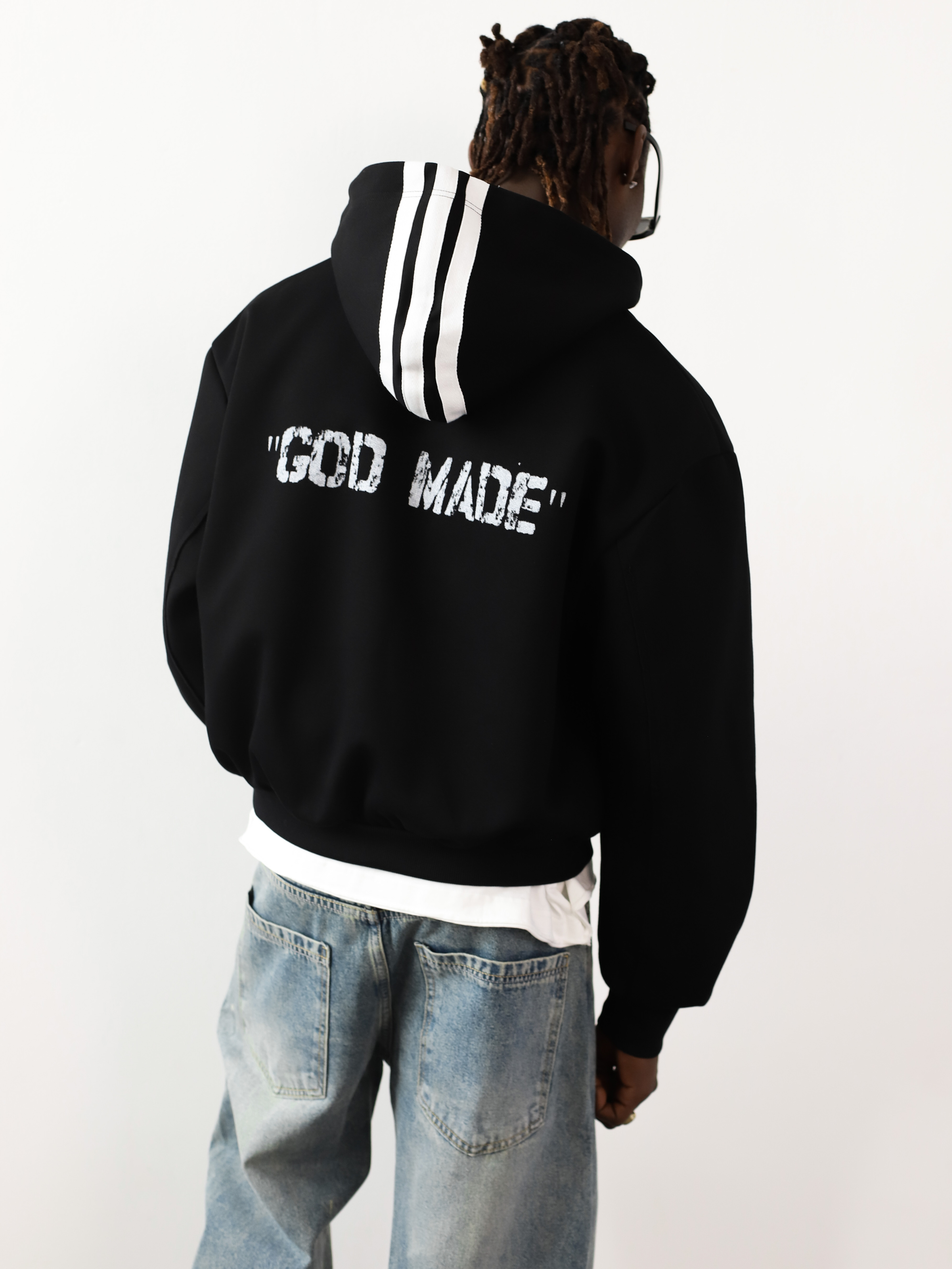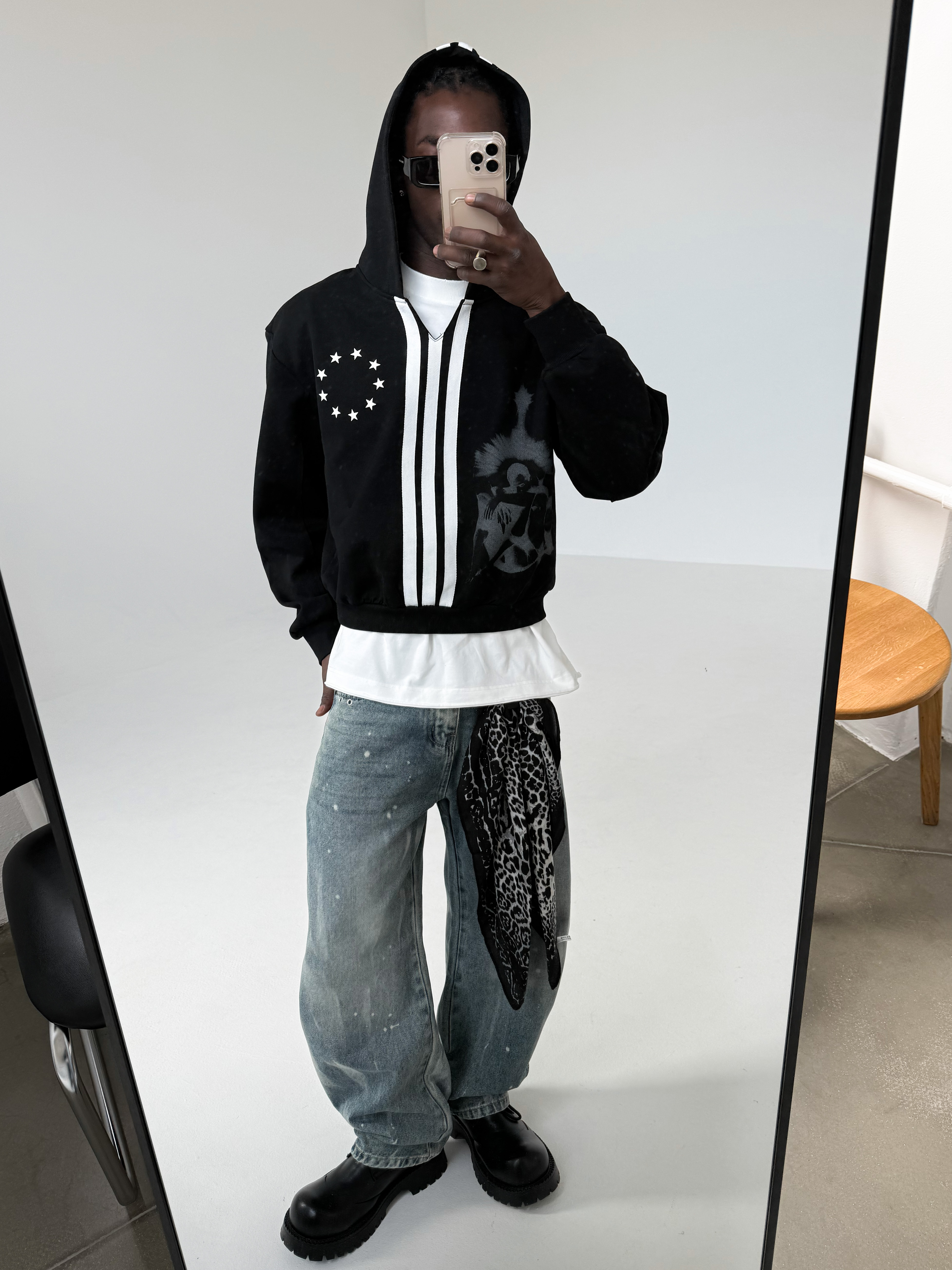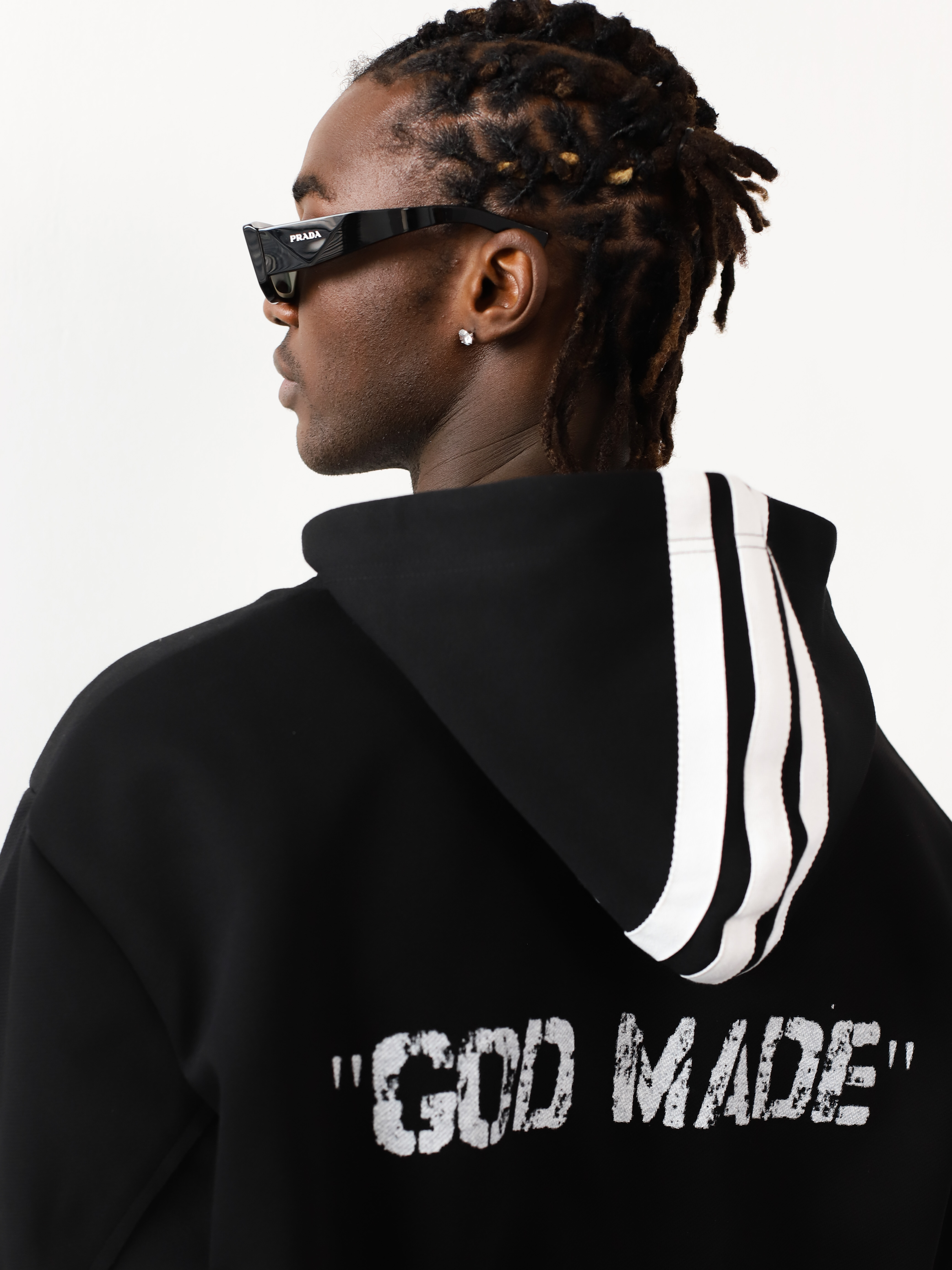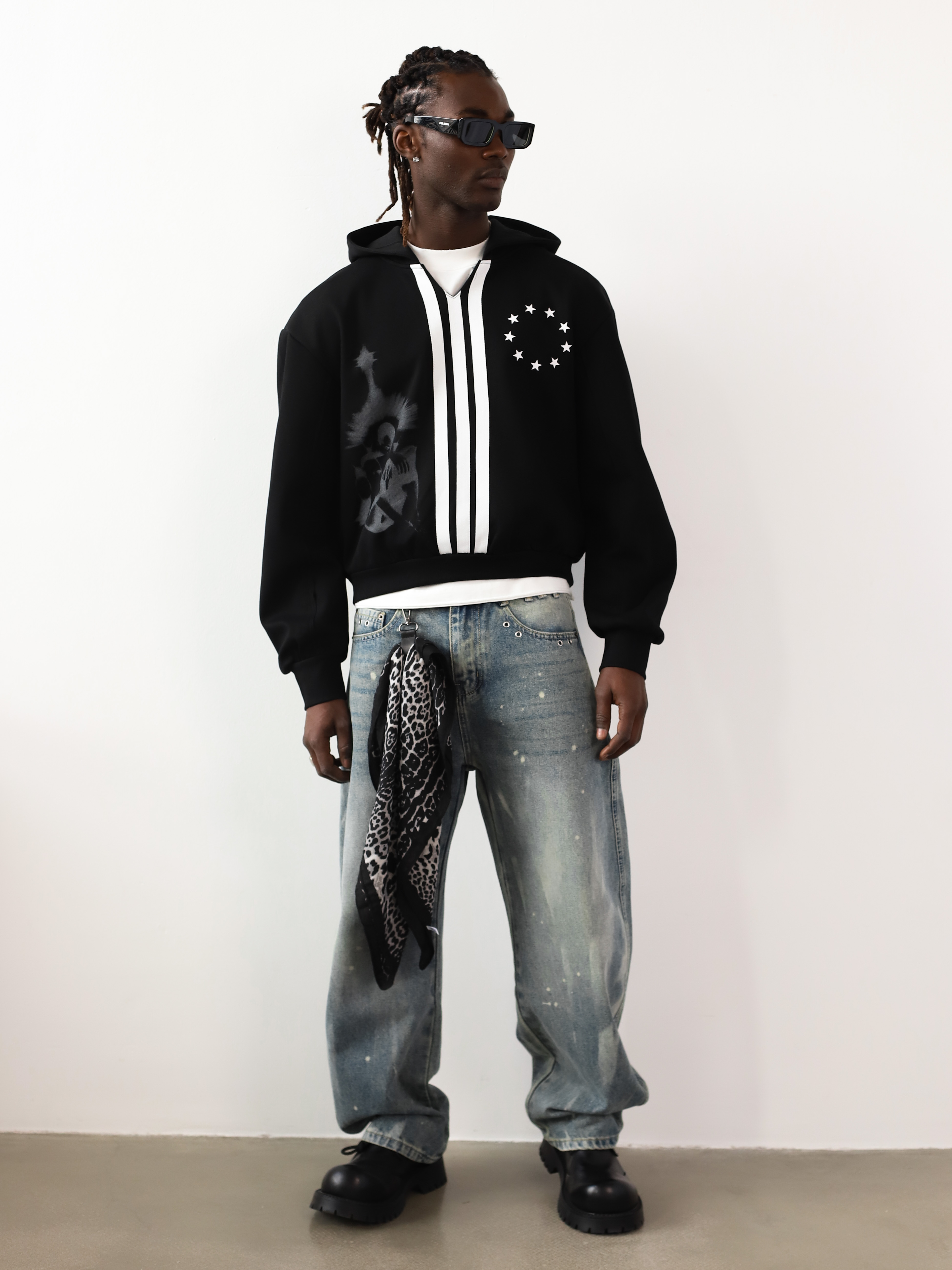 Черная мужская толстовка с принтами и белыми полосами для стильных образов на каждый день.