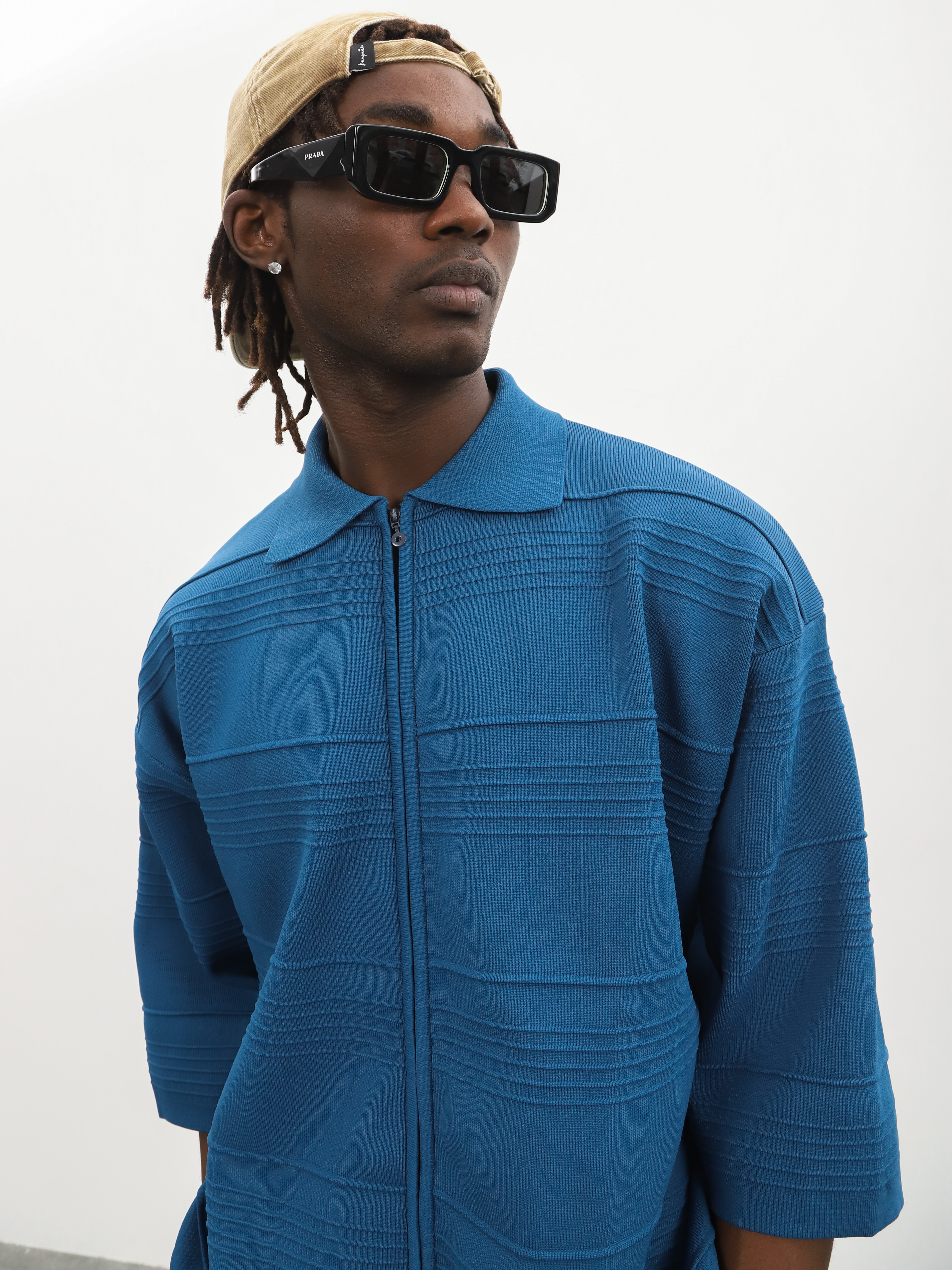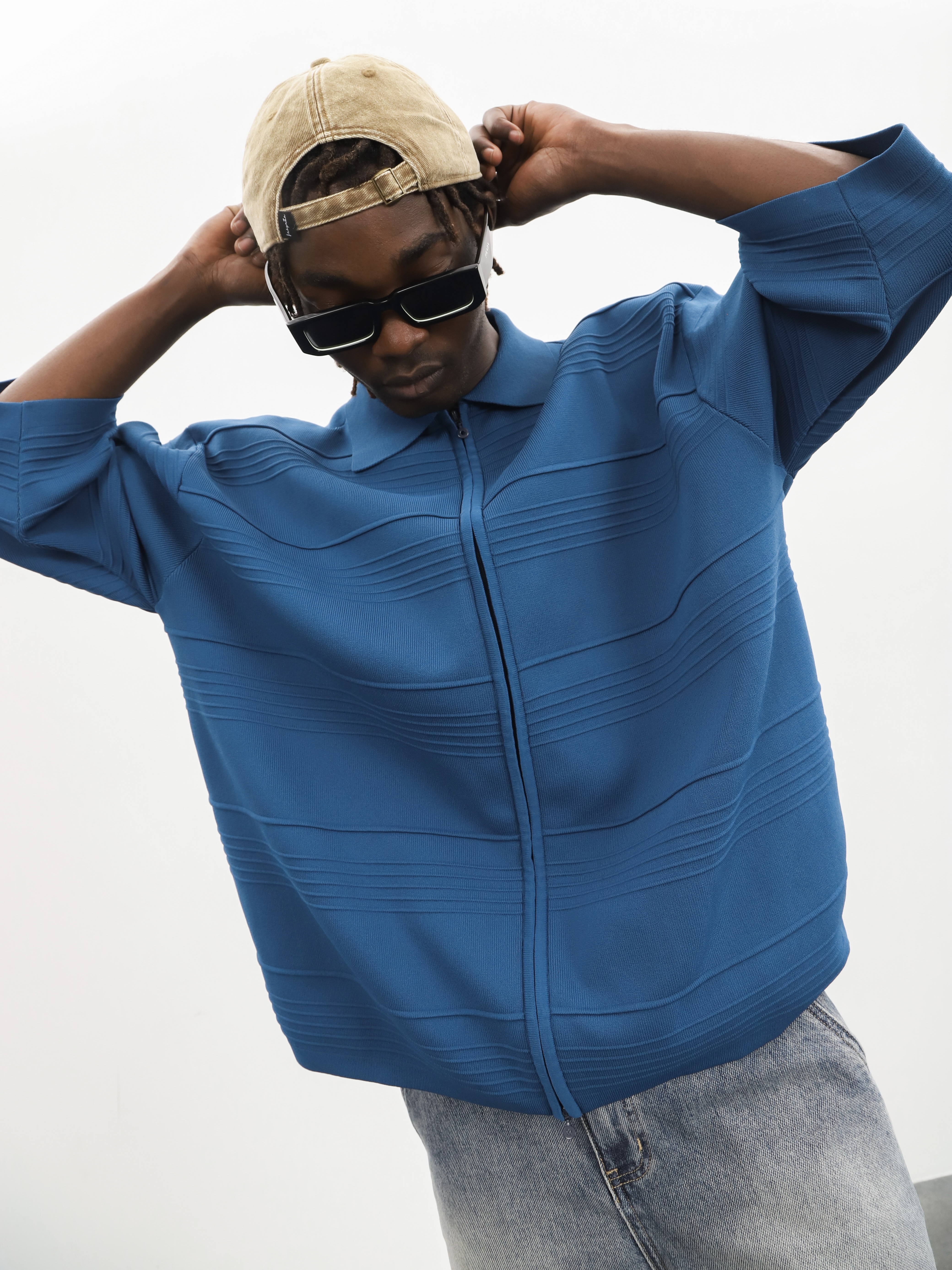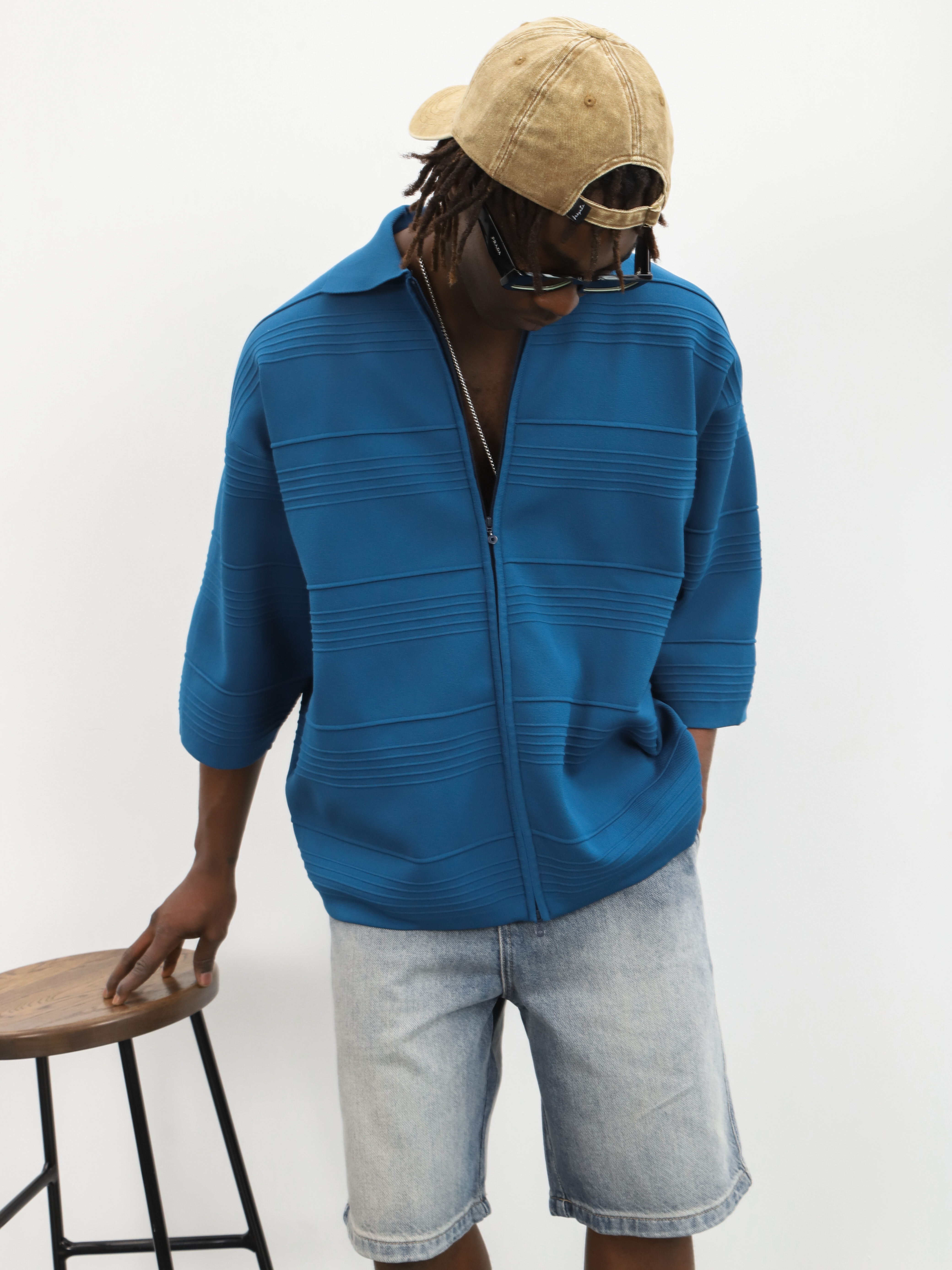 Синяя мужская толстовка на молнии с отложным воротником. Свободная модель для стильных и комфортных повседневных образов.