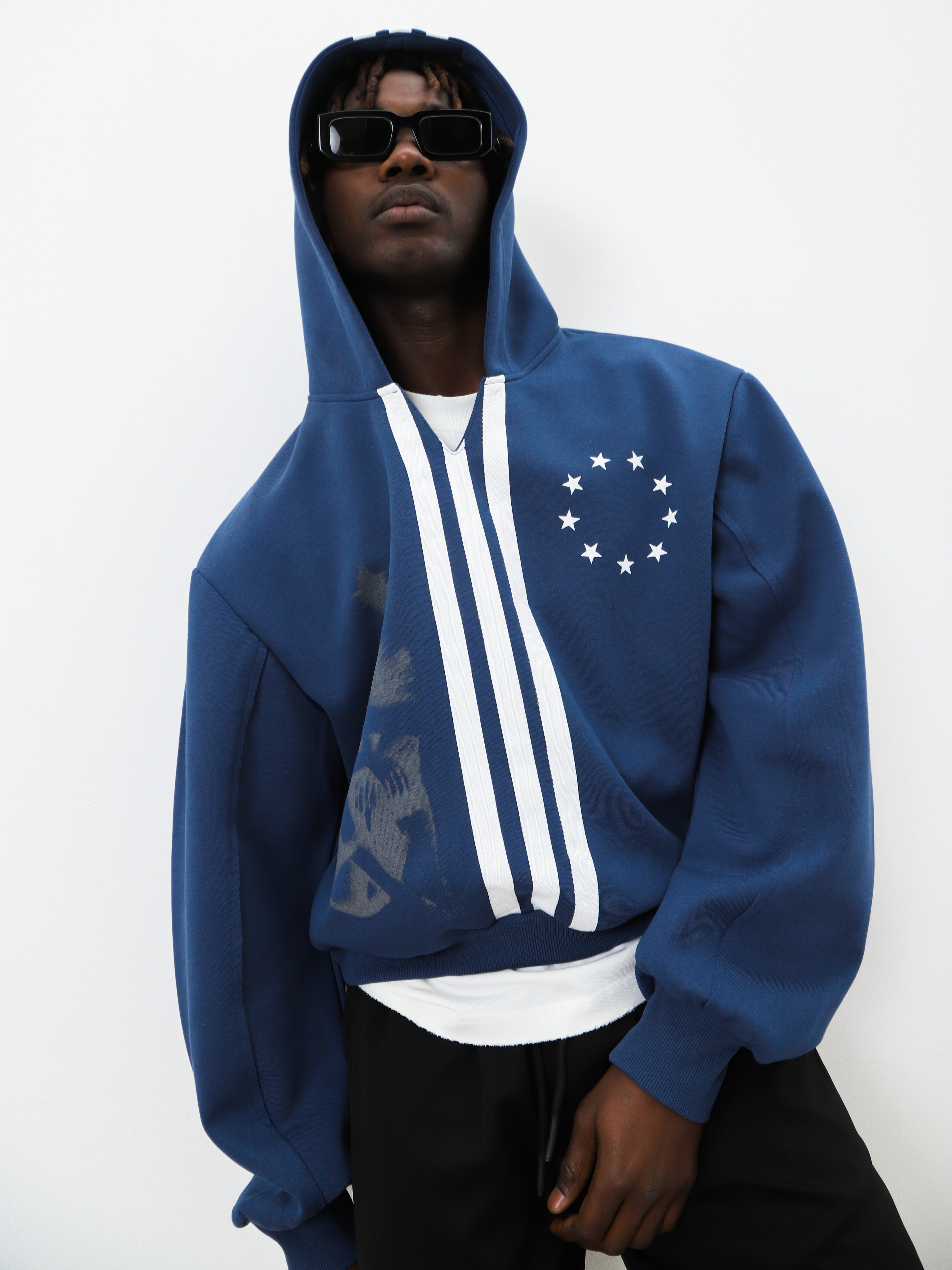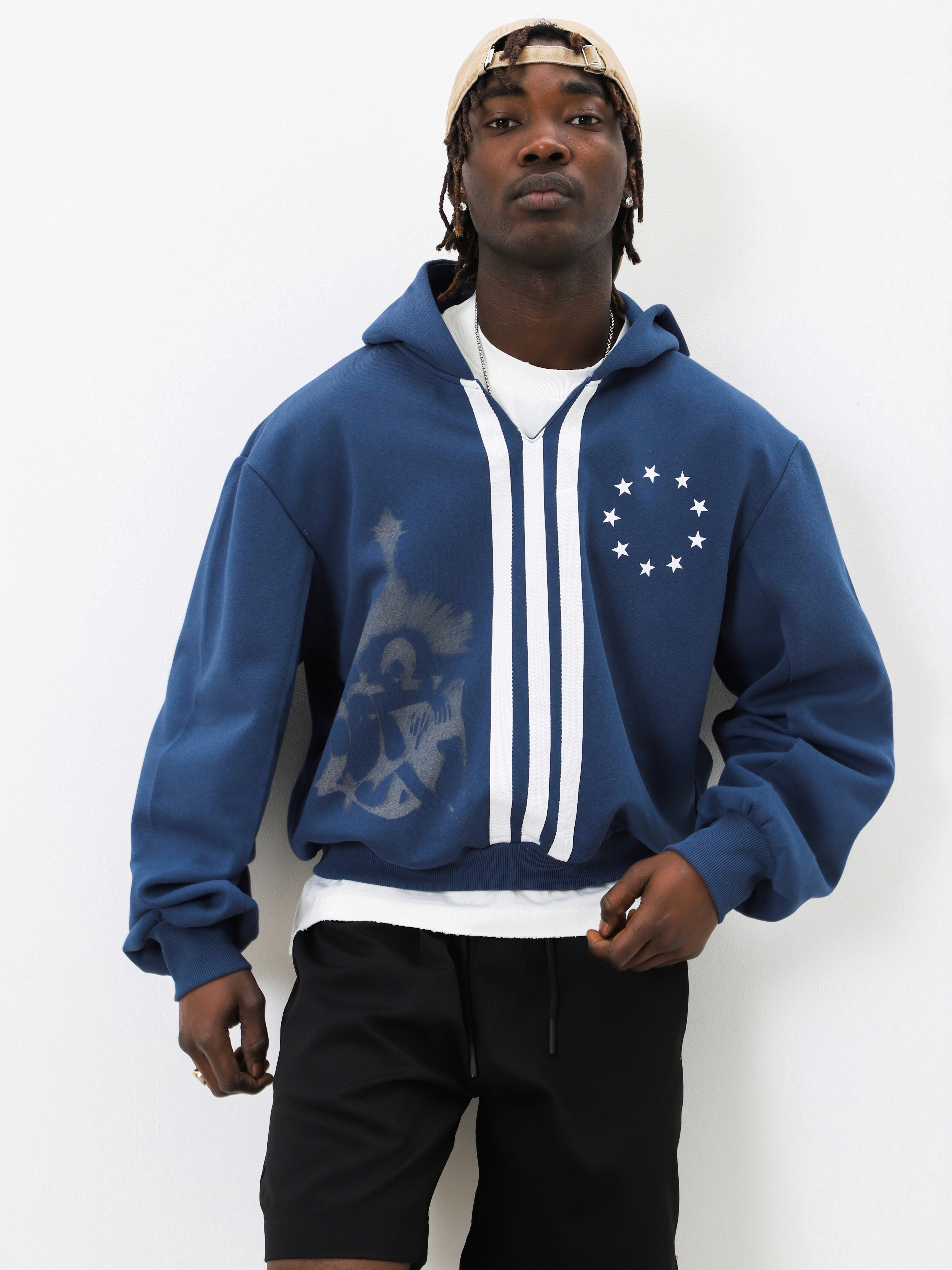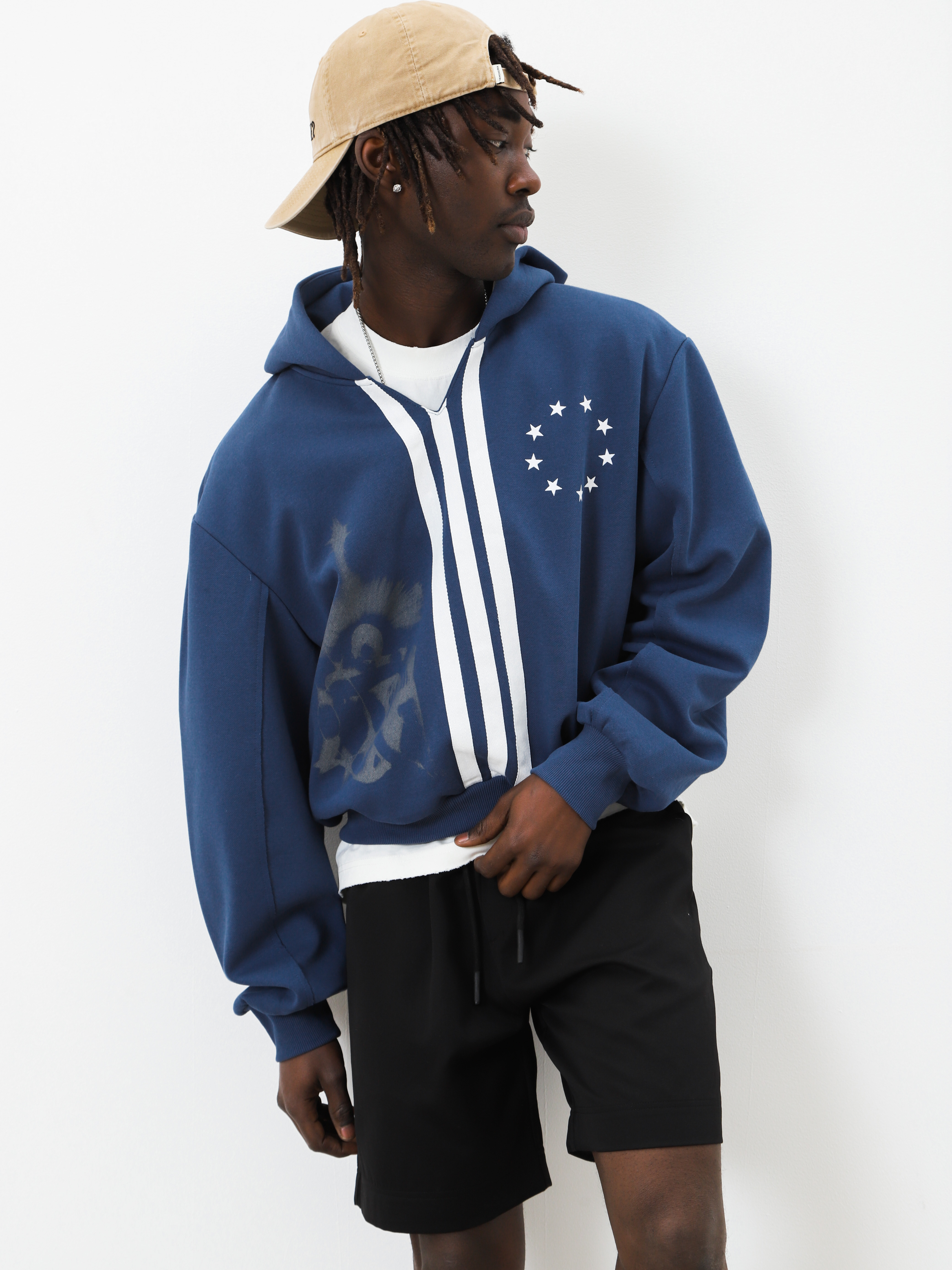 Синяя мужская толстовка с принтами и белыми полосами для стильных образов на каждый день.