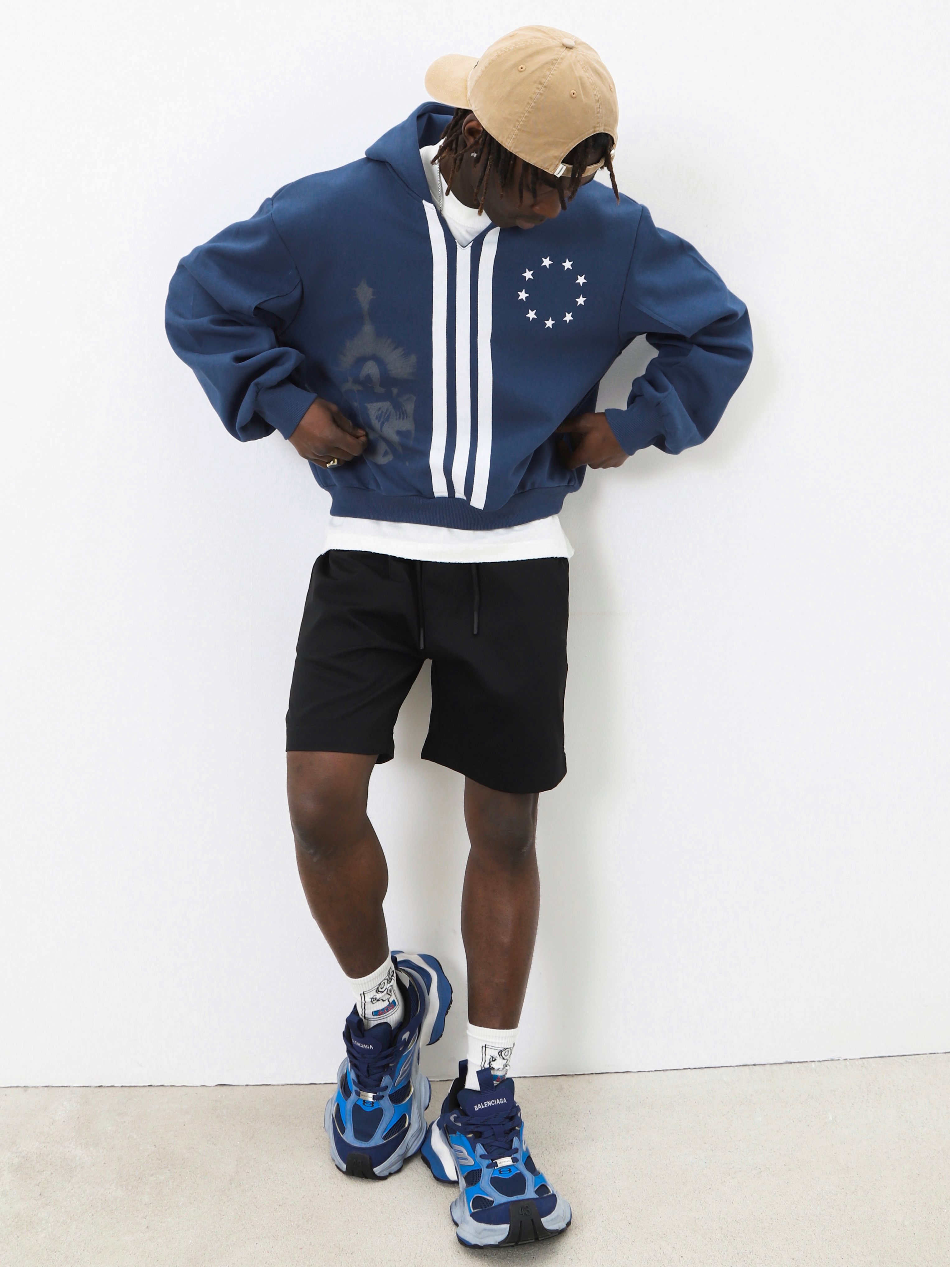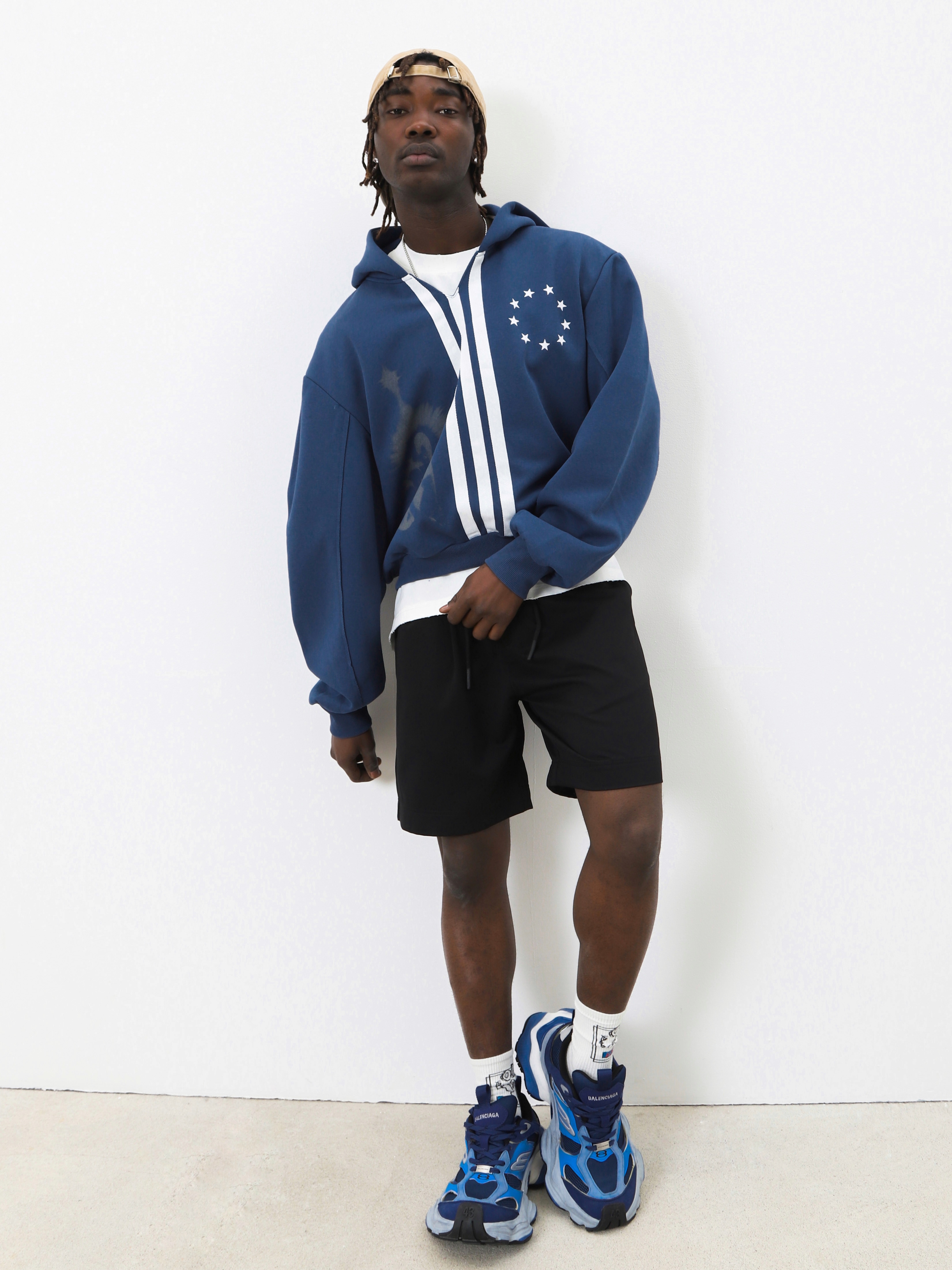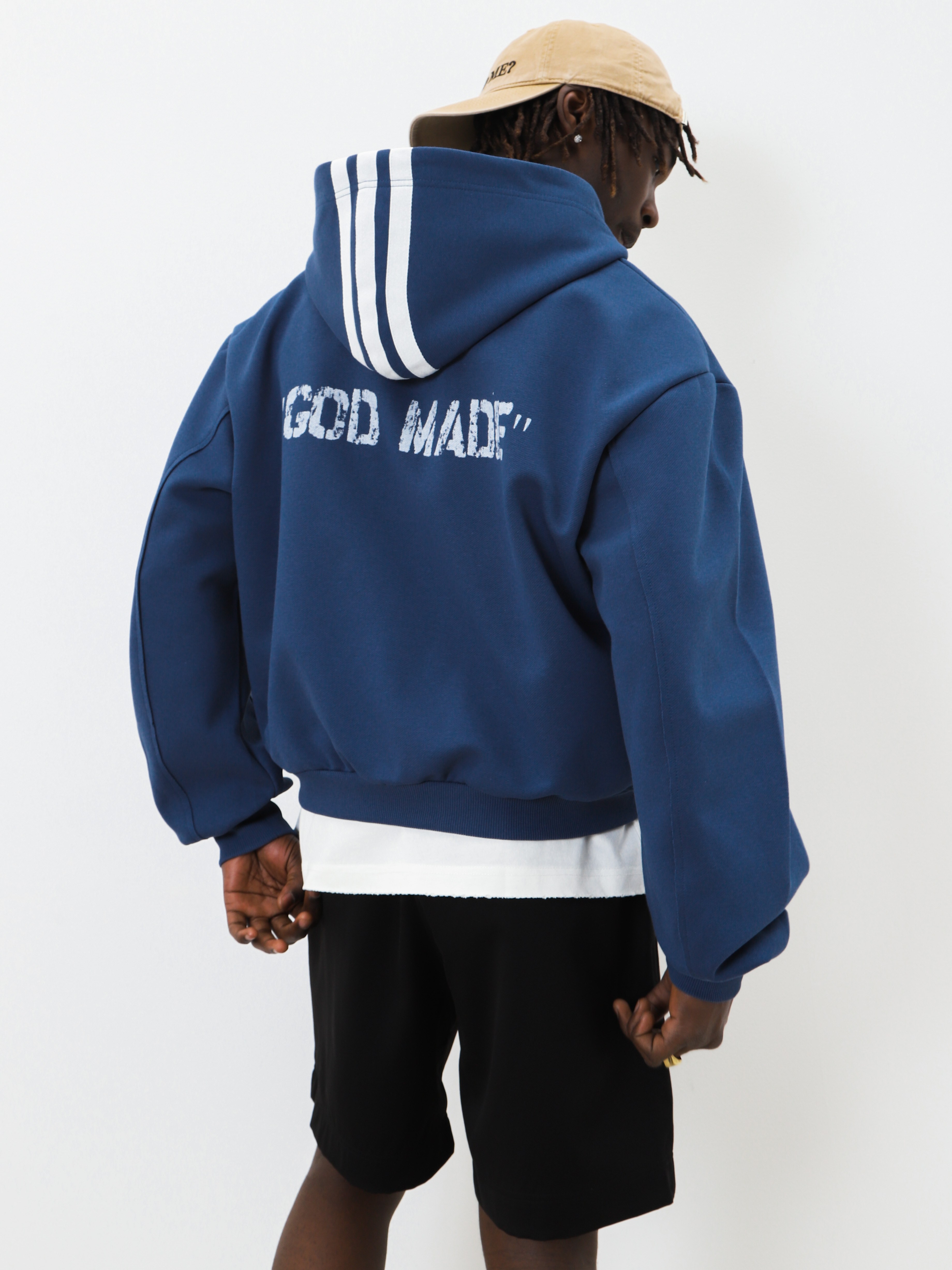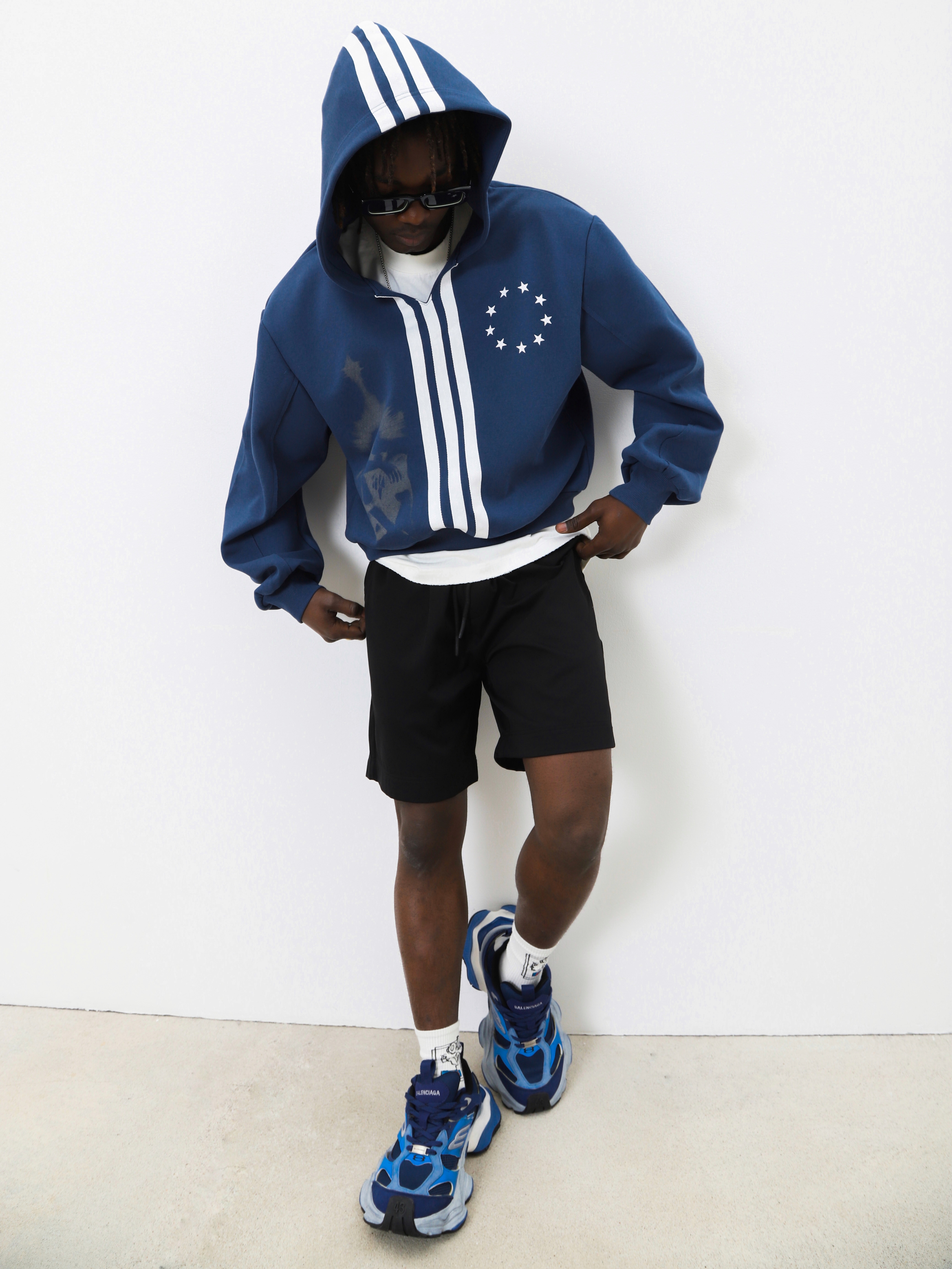 Синяя мужская толстовка с принтами и белыми полосами для стильных образов на каждый день.