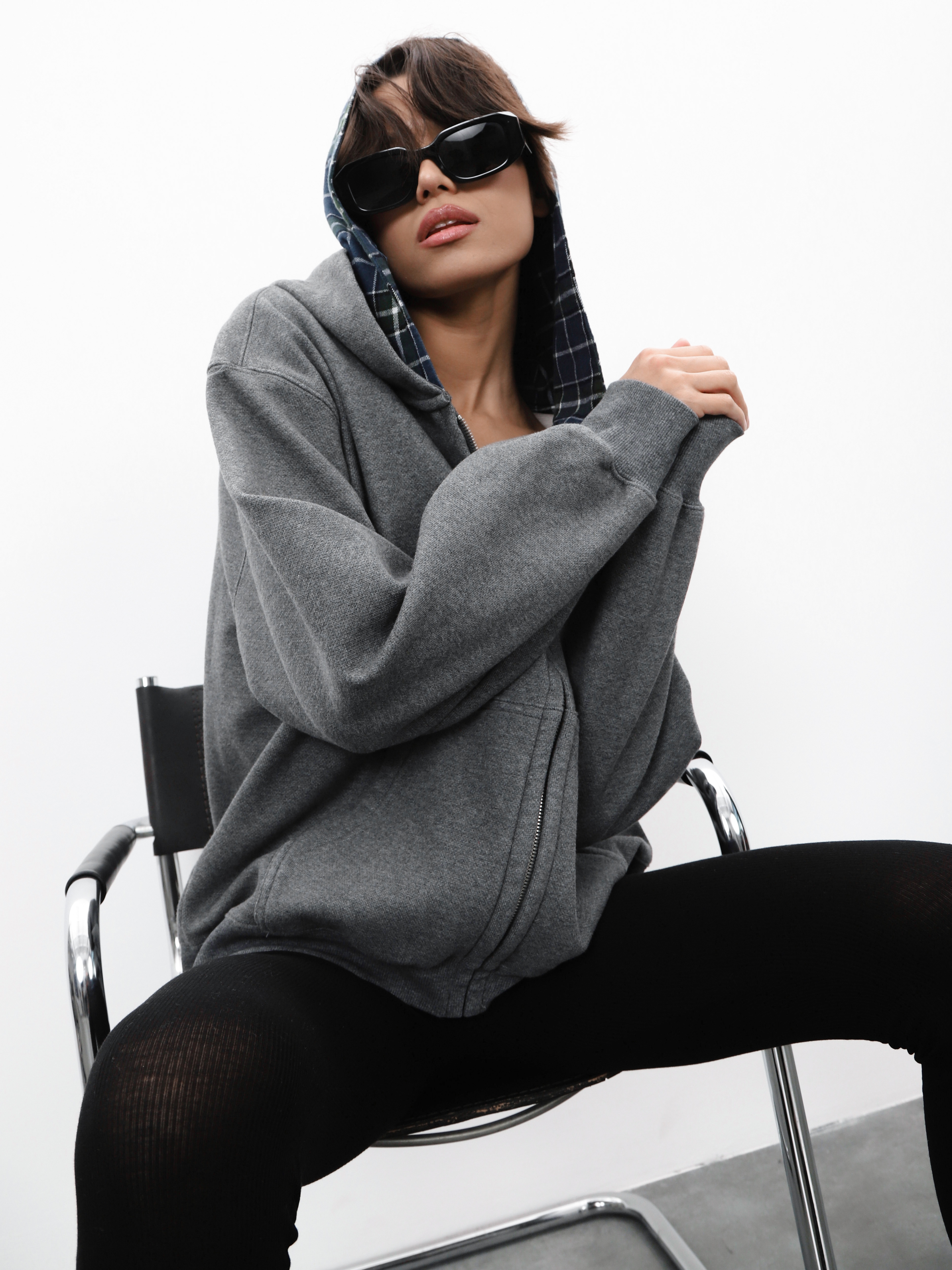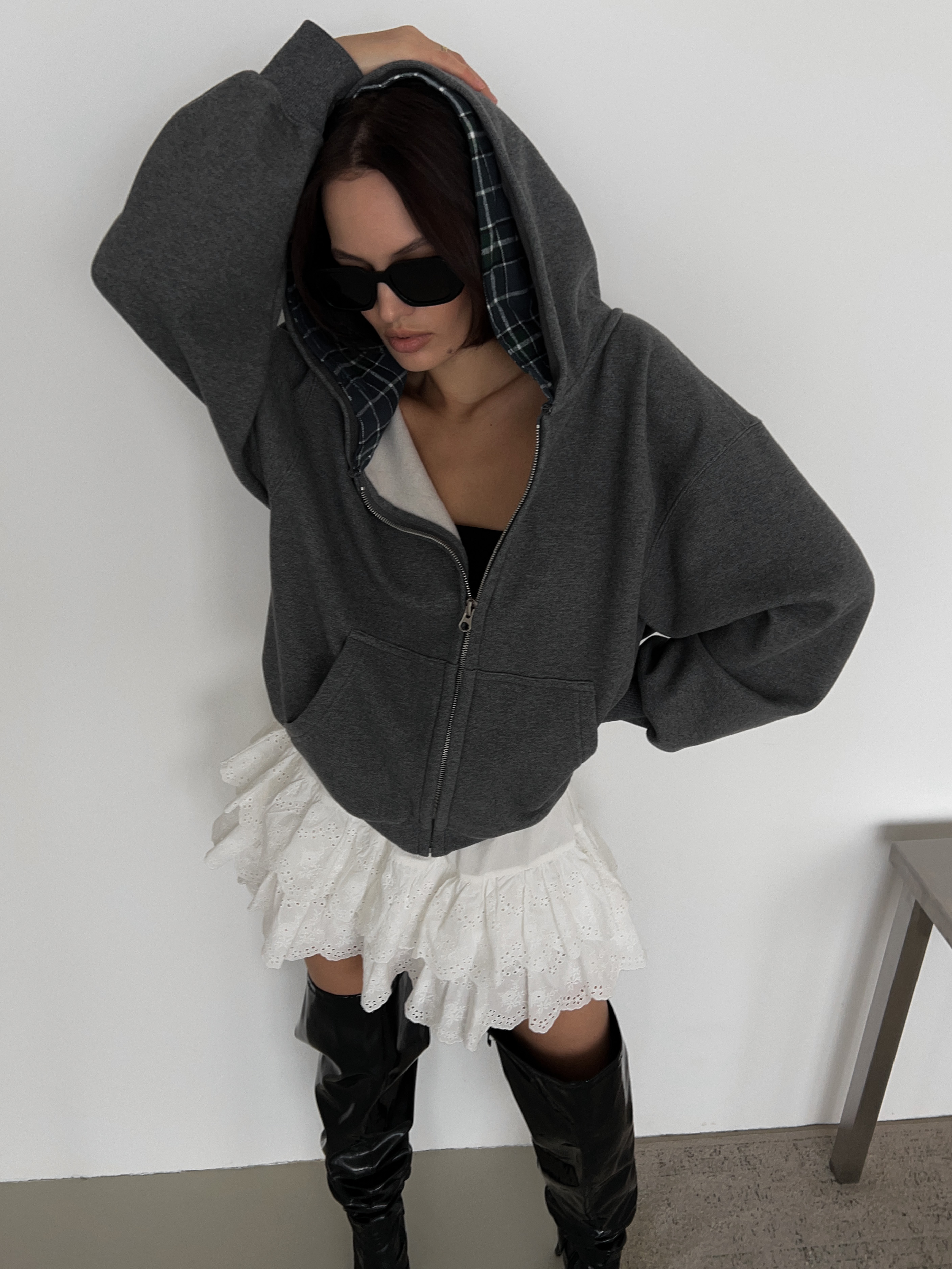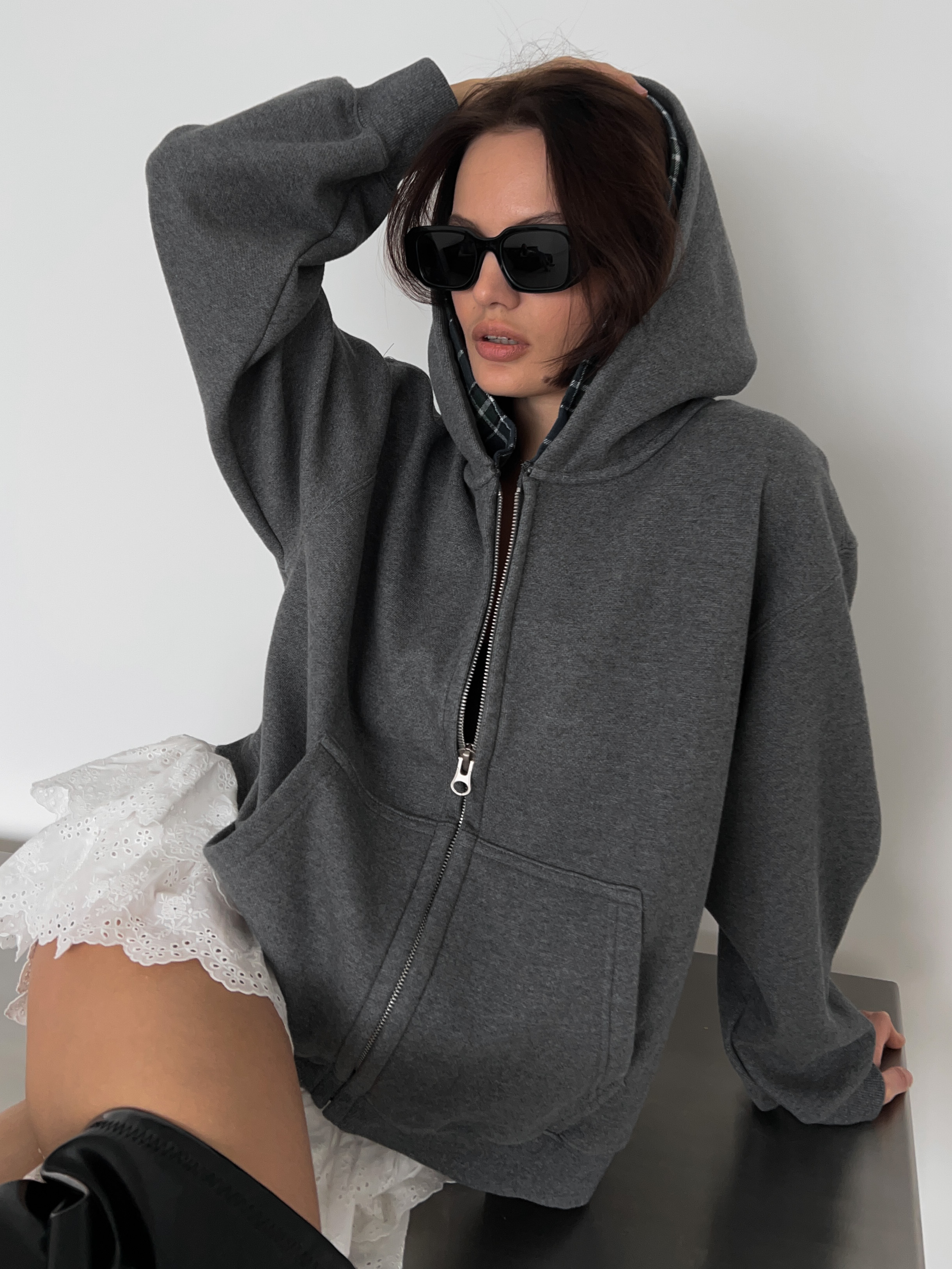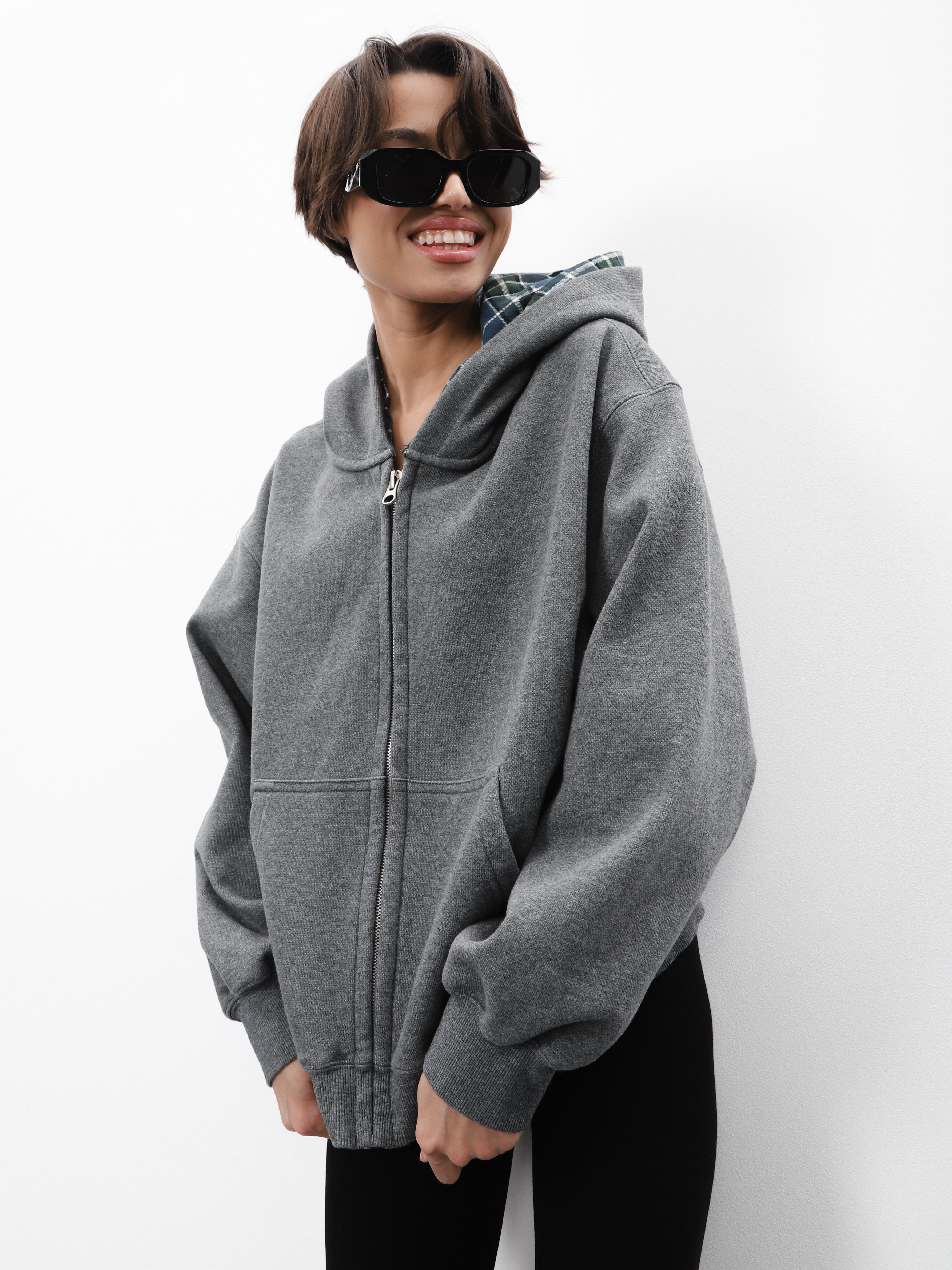 Серая толстовка на молнии с двойным капюшоном. Утепленная модель для стильных повседневных образов.
