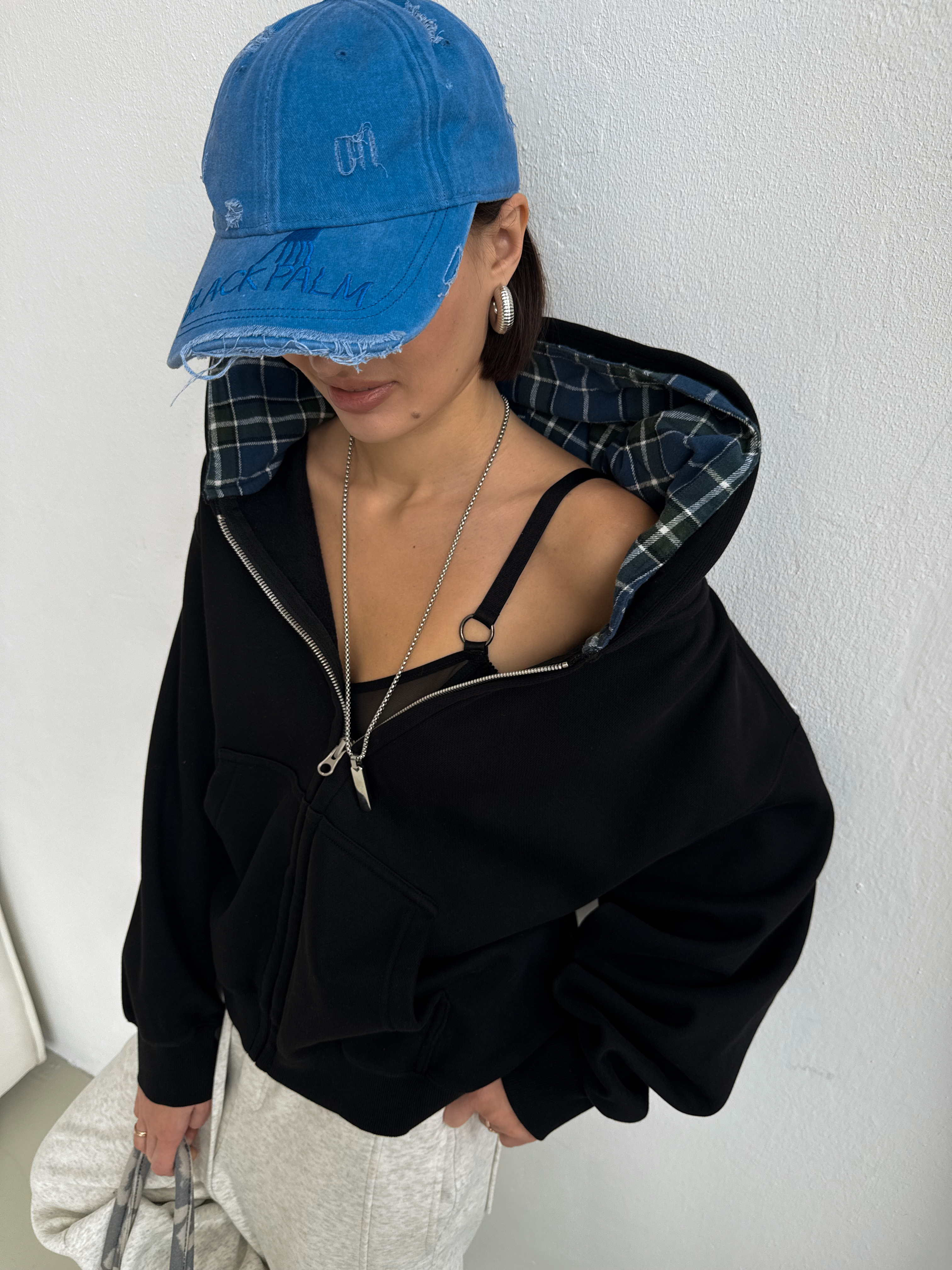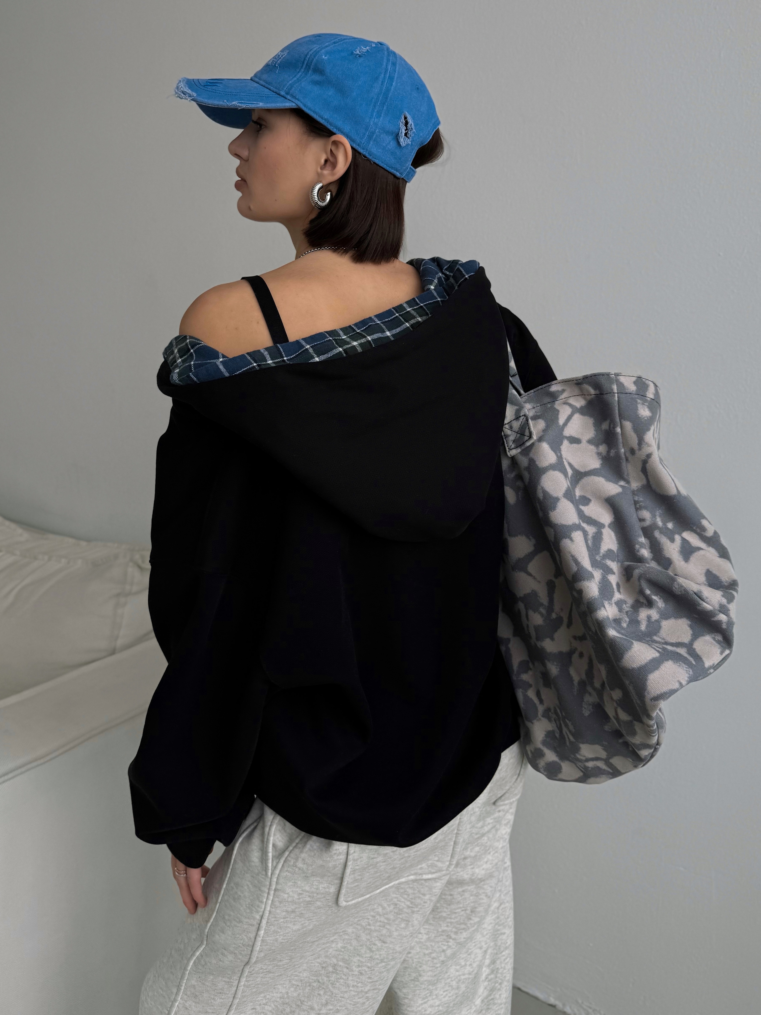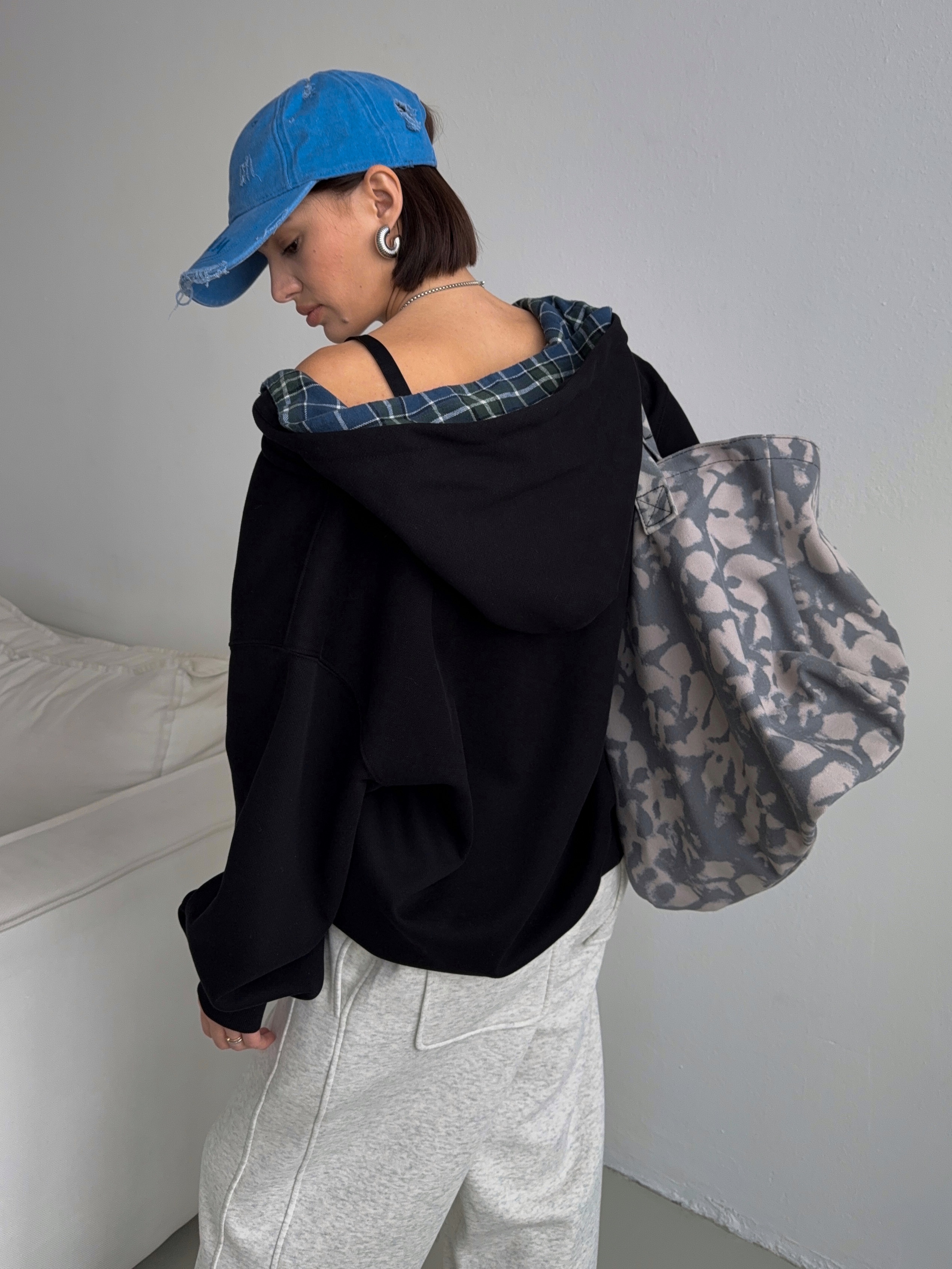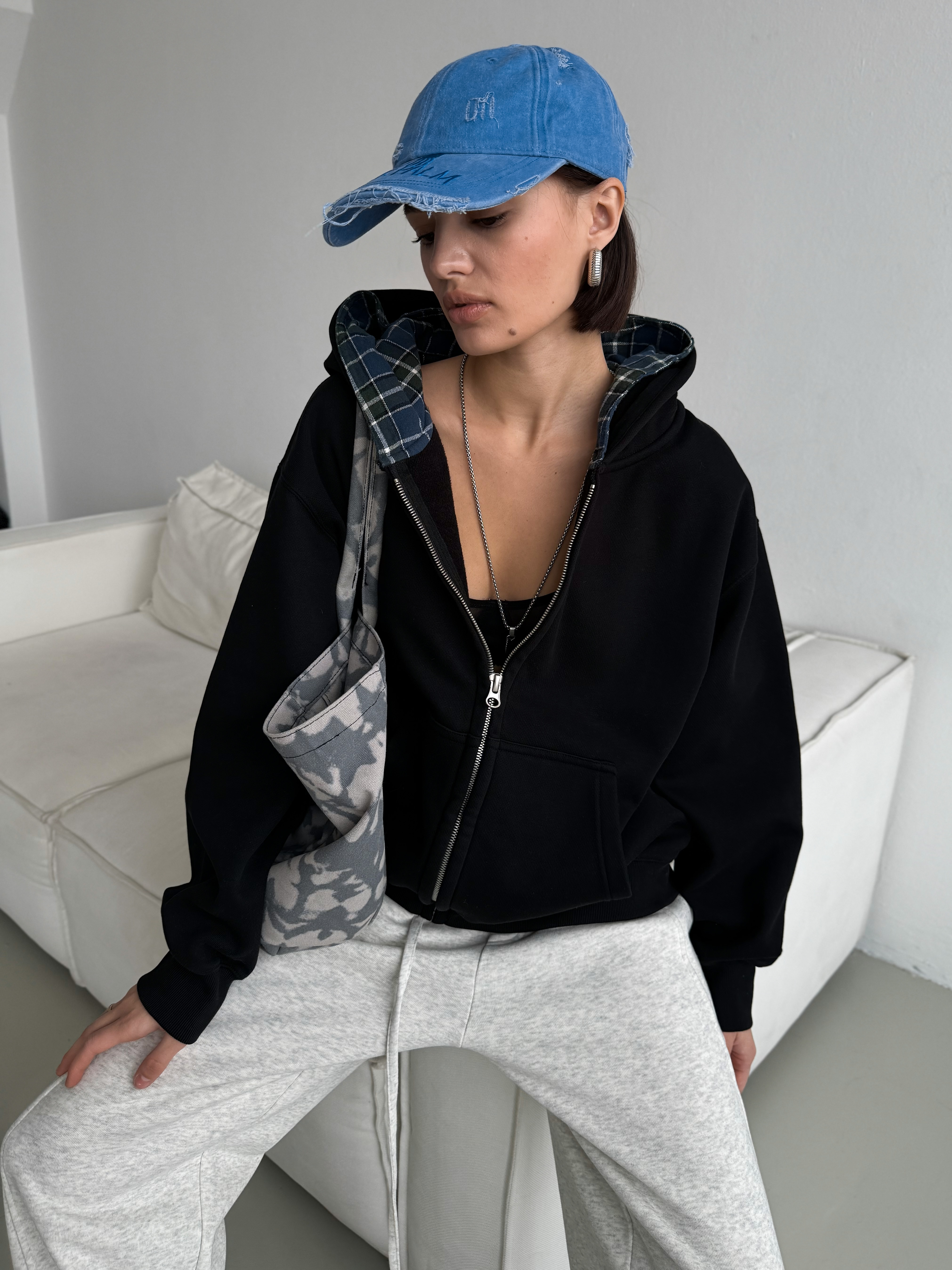 Черная толстовка на молнии с двойным капюшоном. Утепленная модель для стильных повседневных образов.
