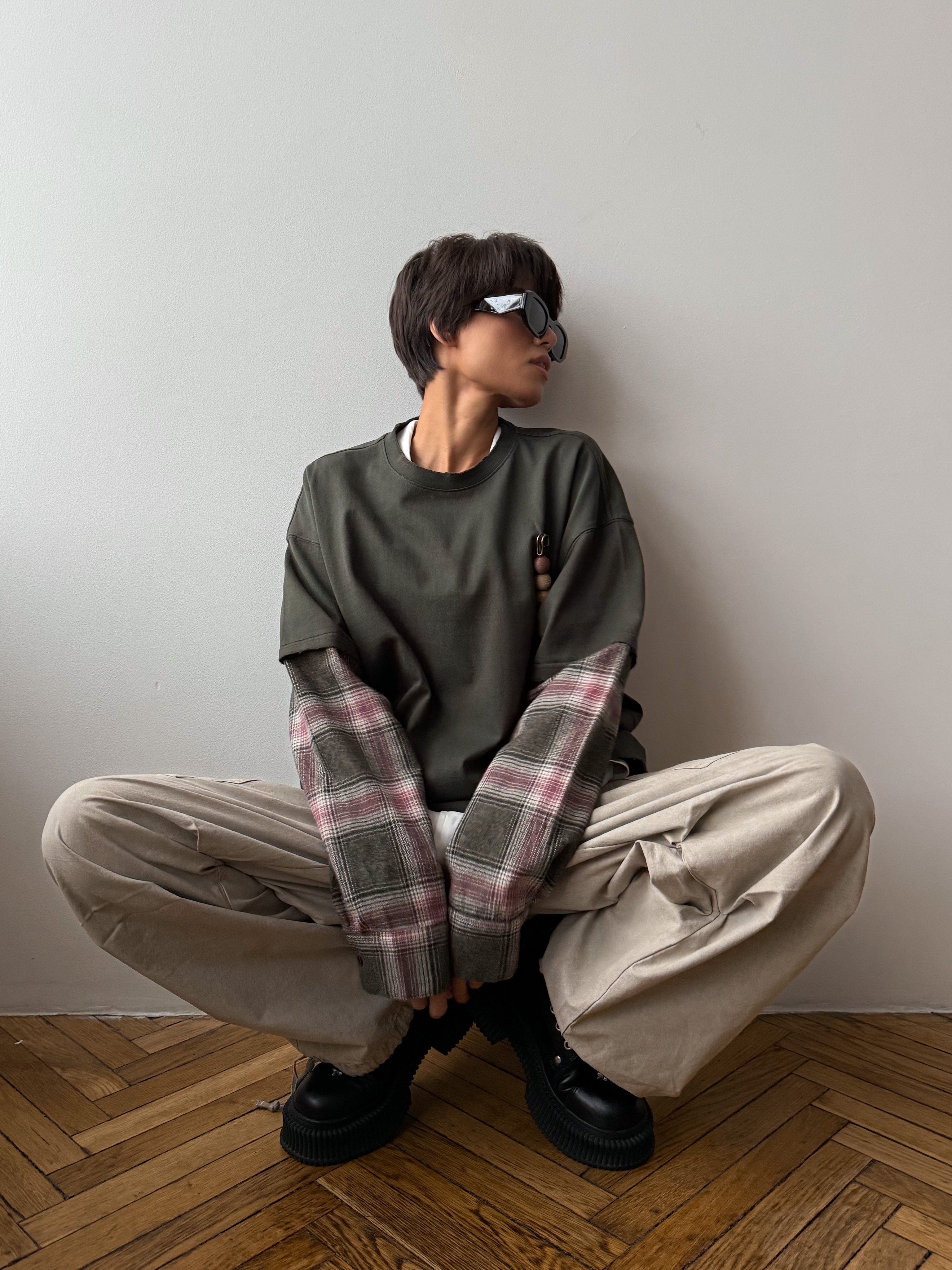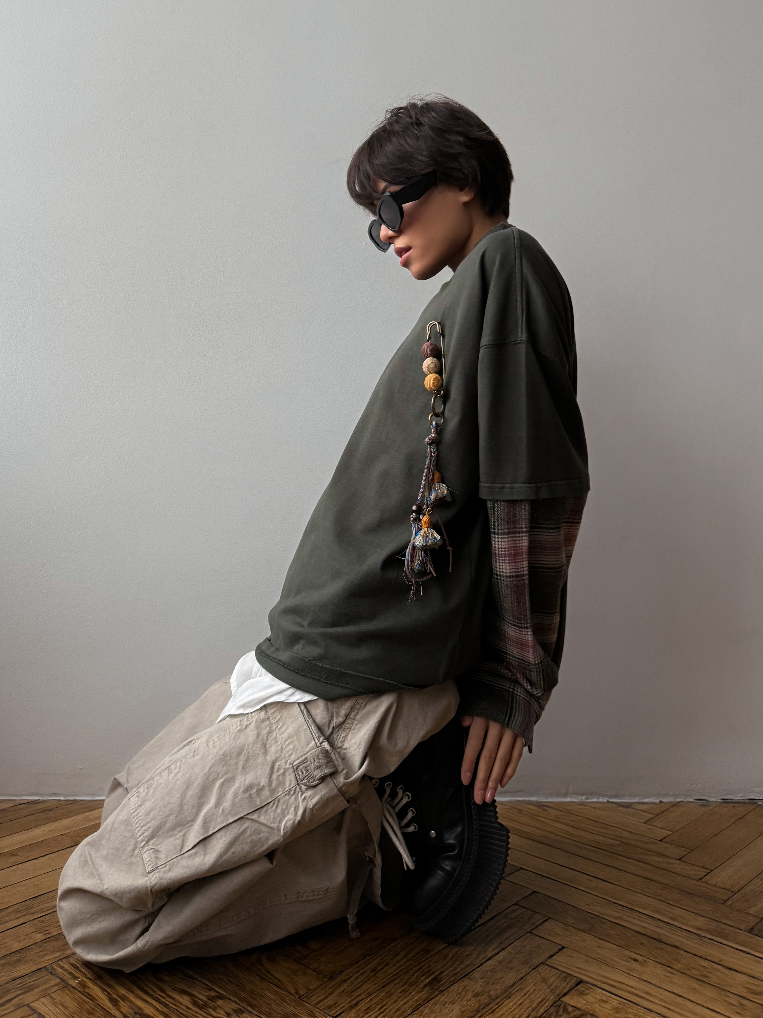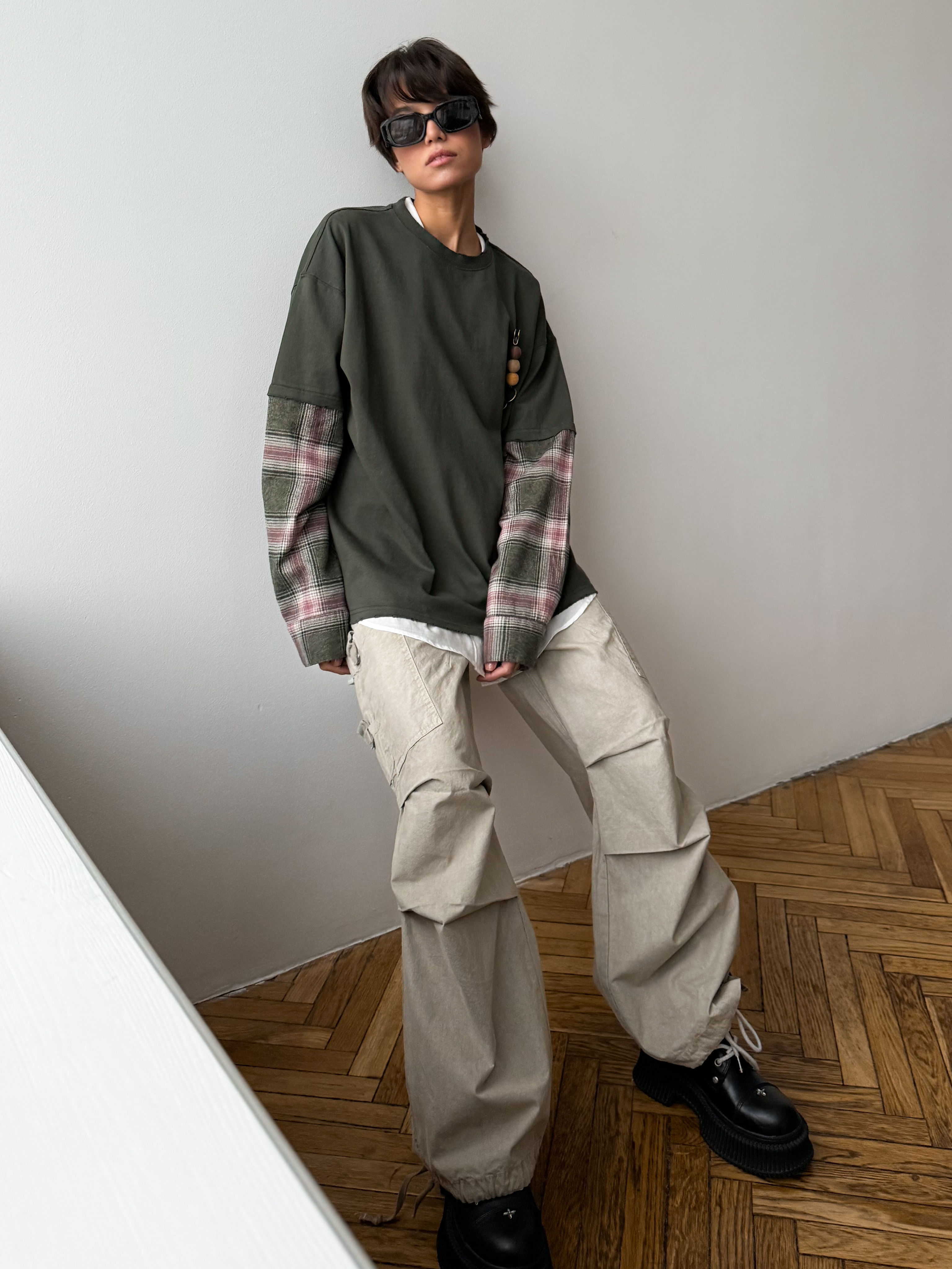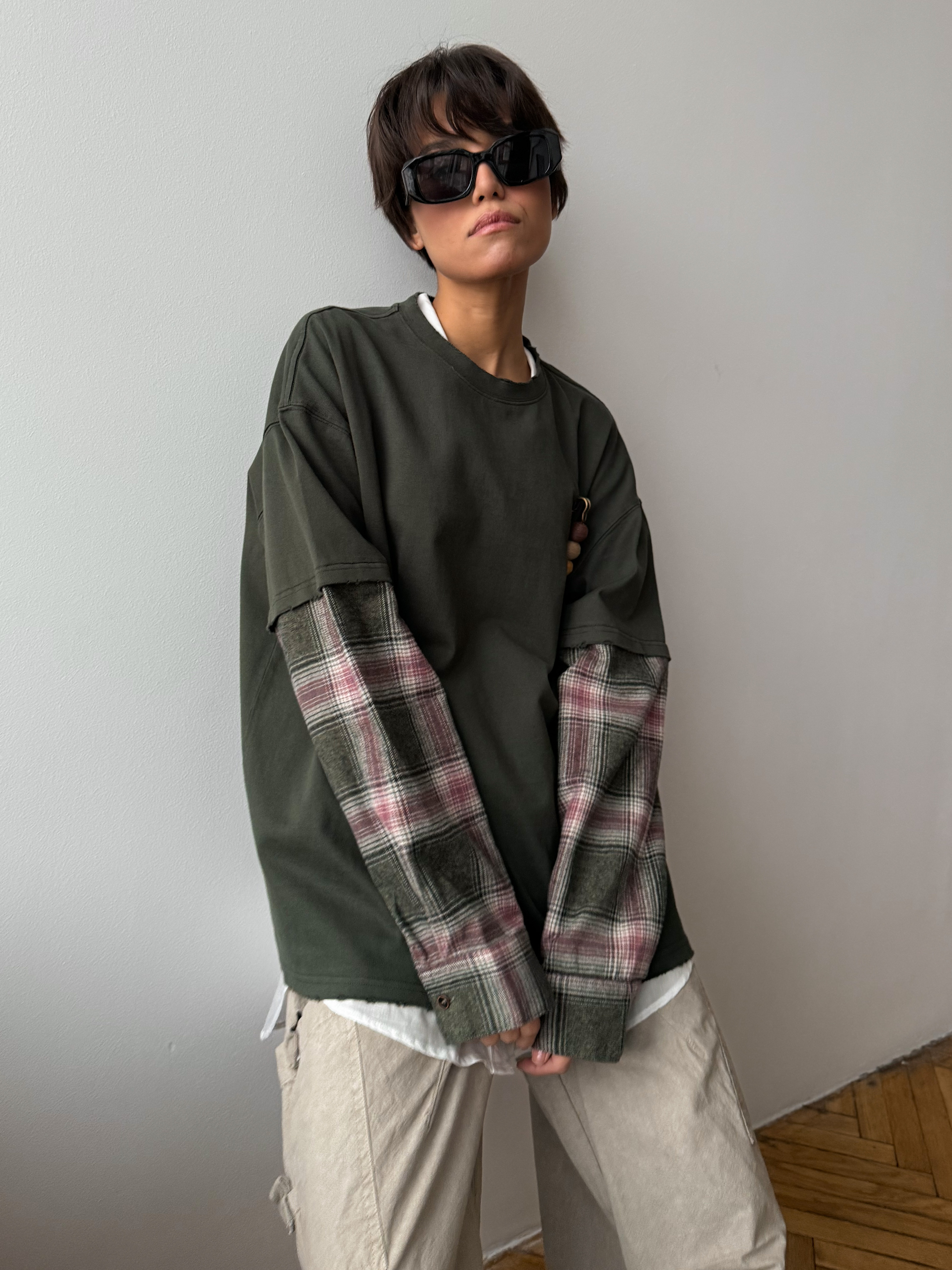 Женский лонгслив оверсайз с имитацией рубашки и эффектом потертого края. Стильная модель с аксессуаром для создания нескучных образов на каждый день.