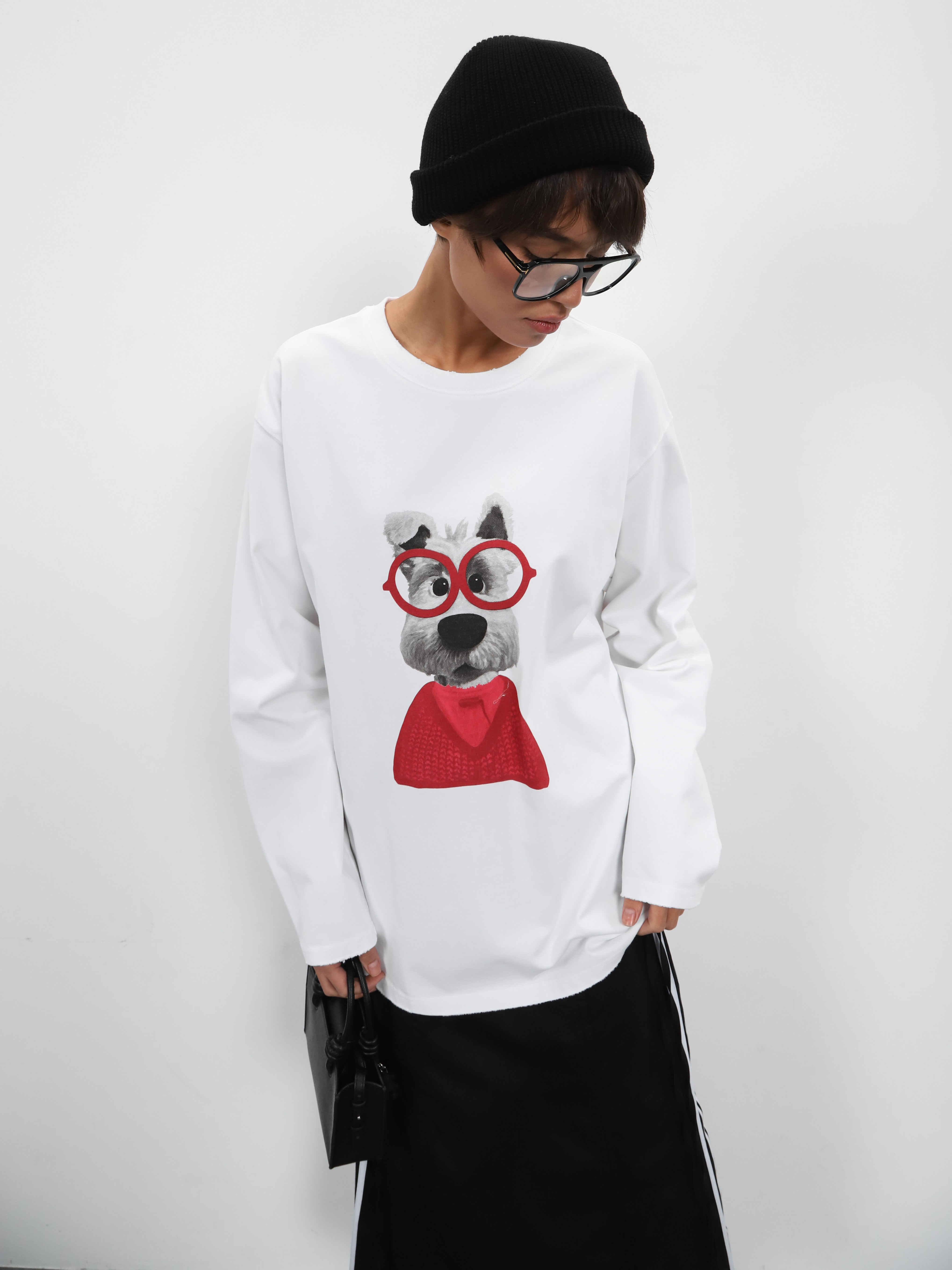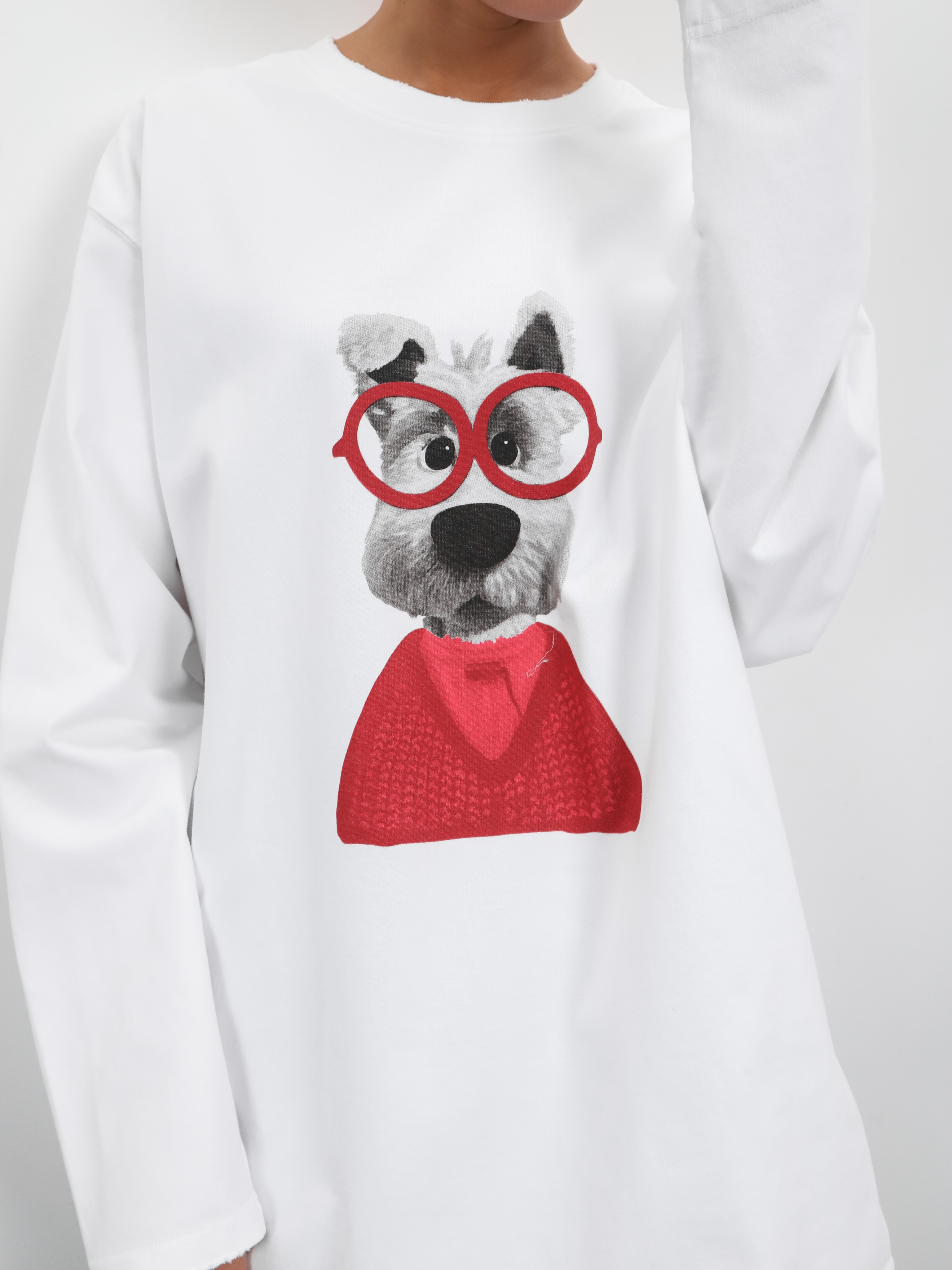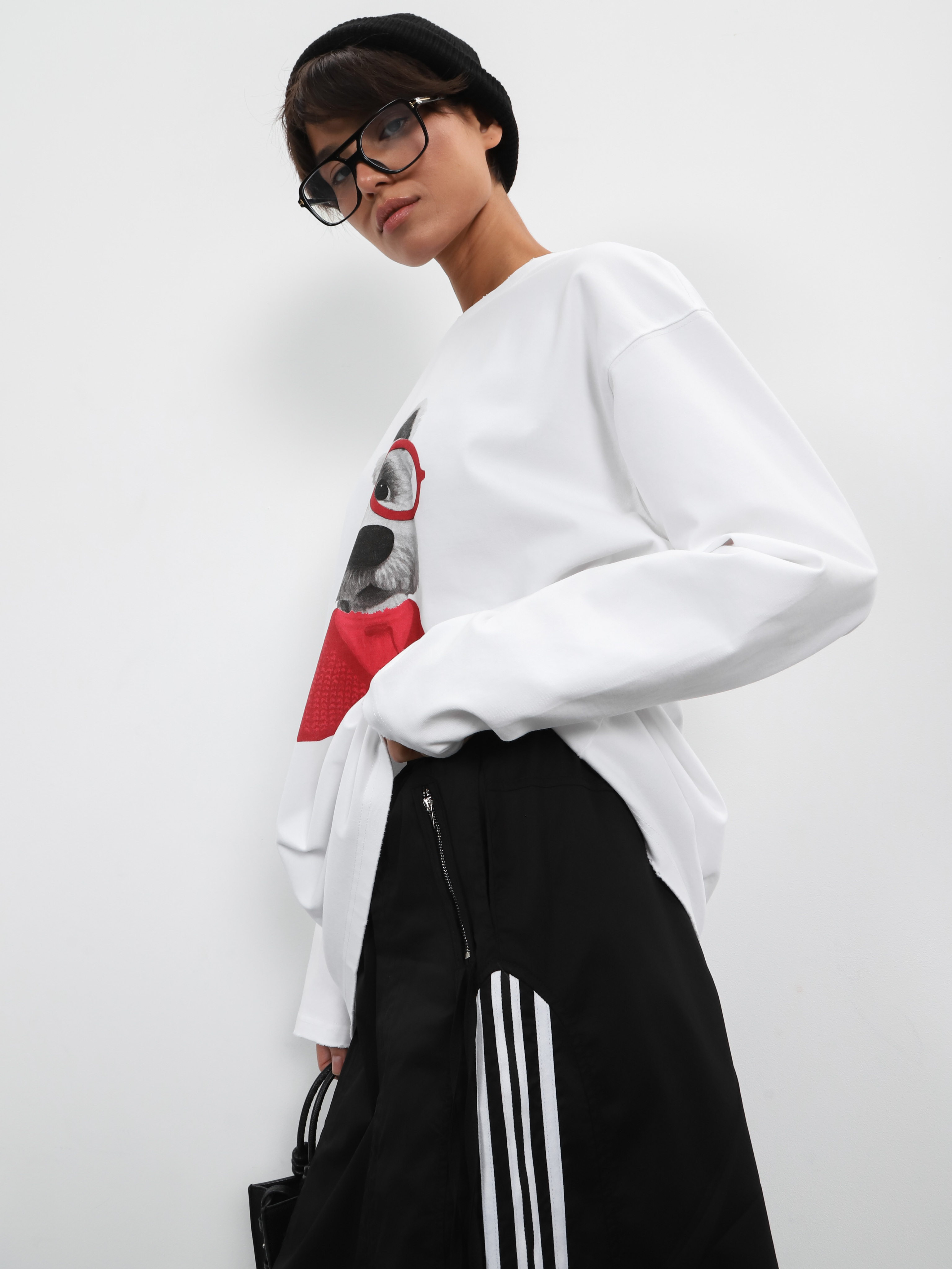 Женский лонгслив с ярким принтом и эффектом потертого края. Стильная модель для создания нескучных образов на каждый день.